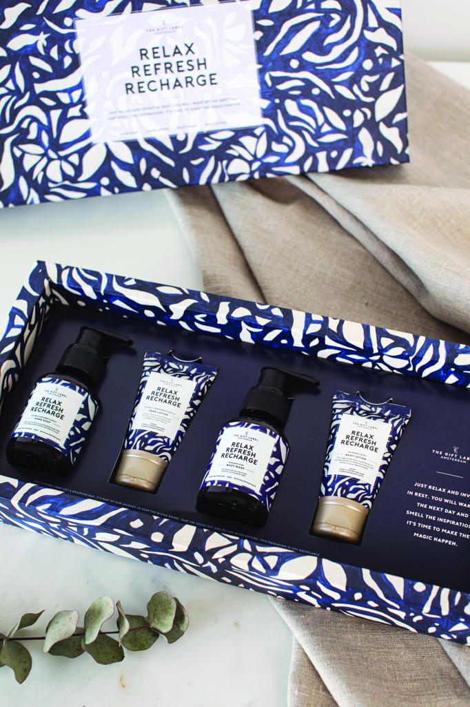 Die Geschenkbox enthält ein Duschgel (100ml), eine Körperlotion (50ml), eine Handseife (100ml) und eine Handcreme (50ml) mit einer Mandarinen-Moschus- und Kumquat-Bourbon-Vanille-Duftnote.