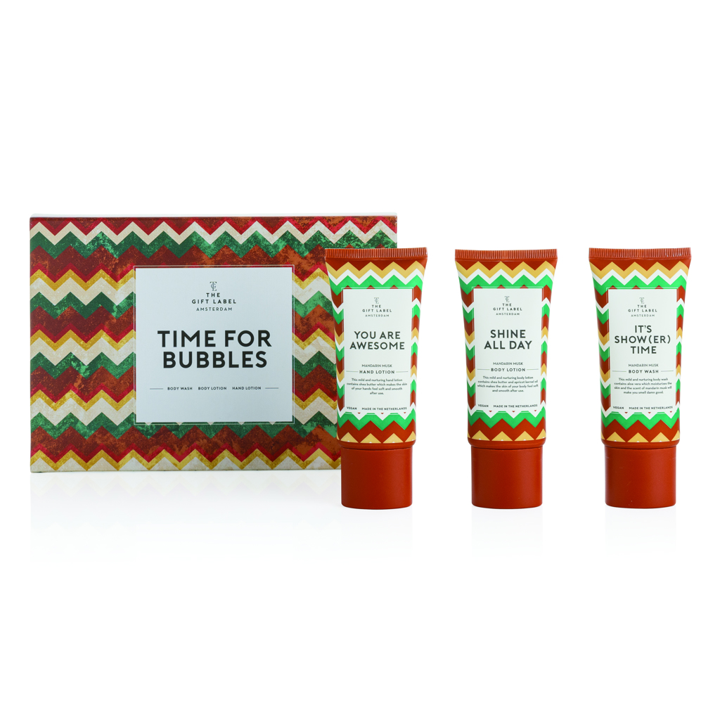 Es ist gefüllt mit veganer Handcreme (50ml), Duschgel (50ml) und Körperlotion (50ml) mit Mandarinen-Moschus-Duft.