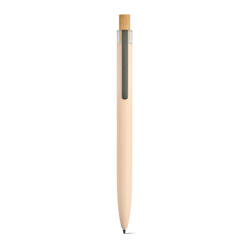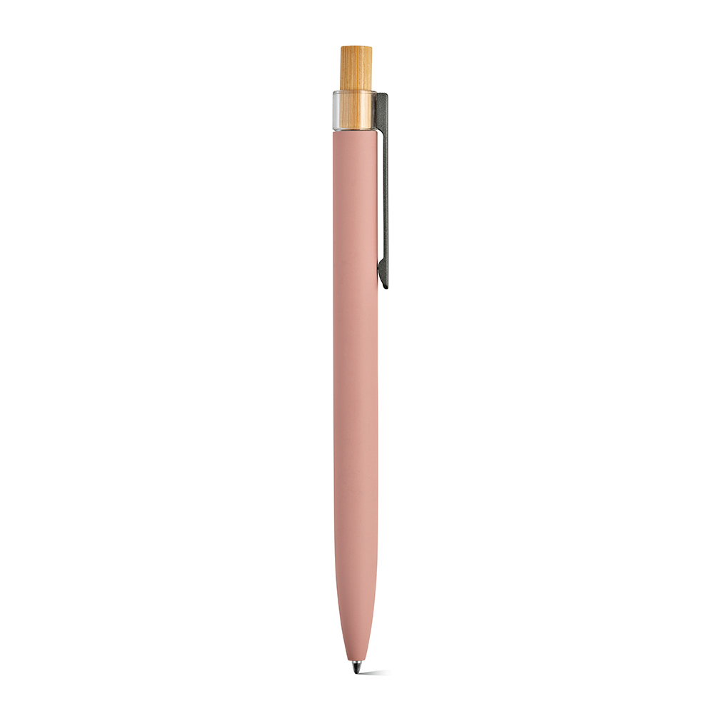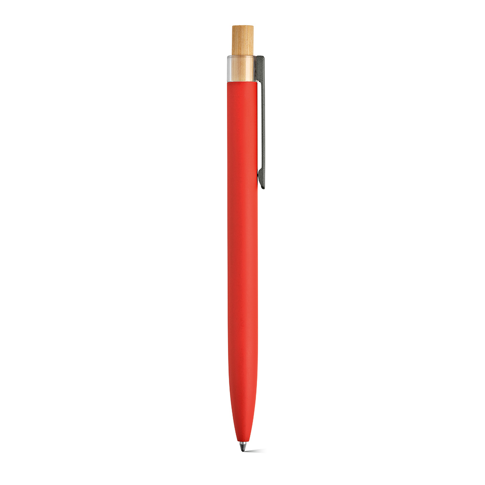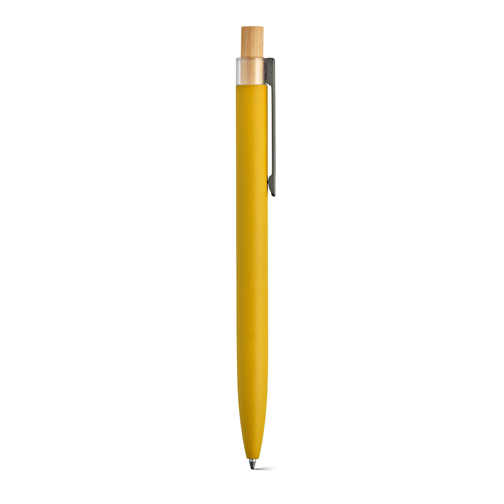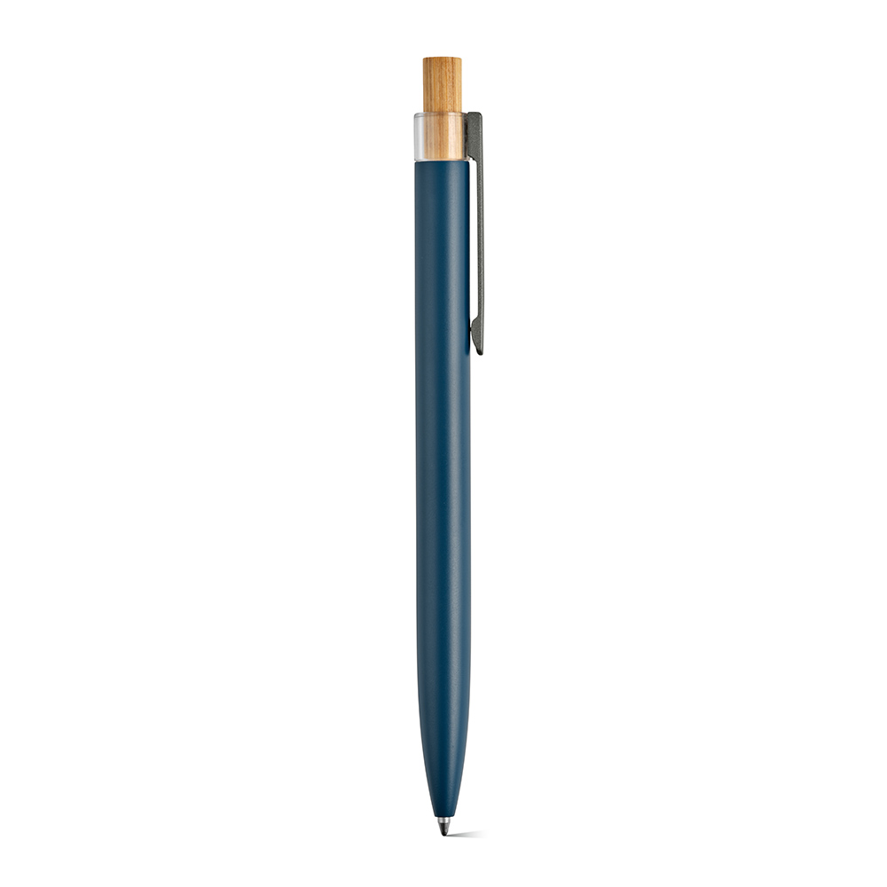 Ein umweltbewusster Kugelschreiber, der mit einer Oberfläche aus recyceltem Aluminium und Element aus rPET und Bambus auf der Oberseite ausgestattet ist.
