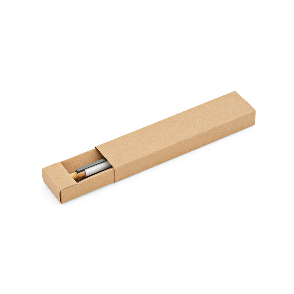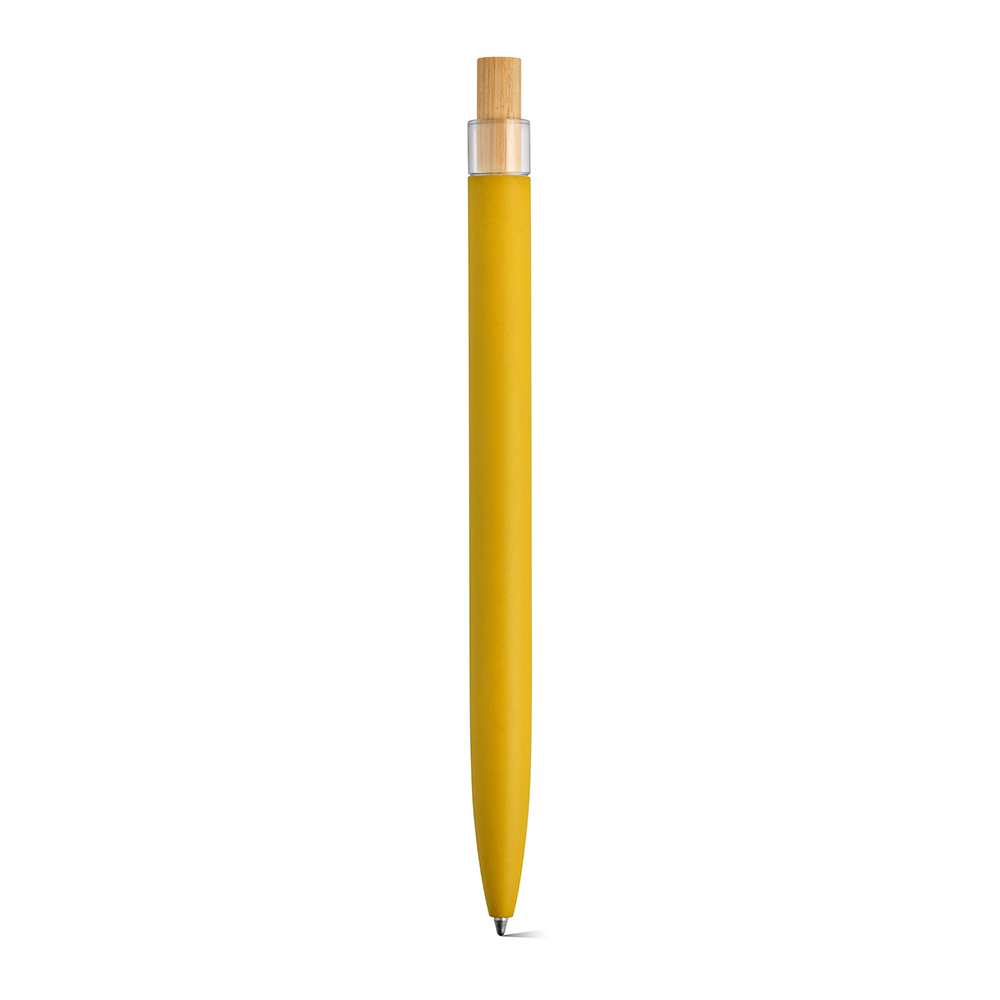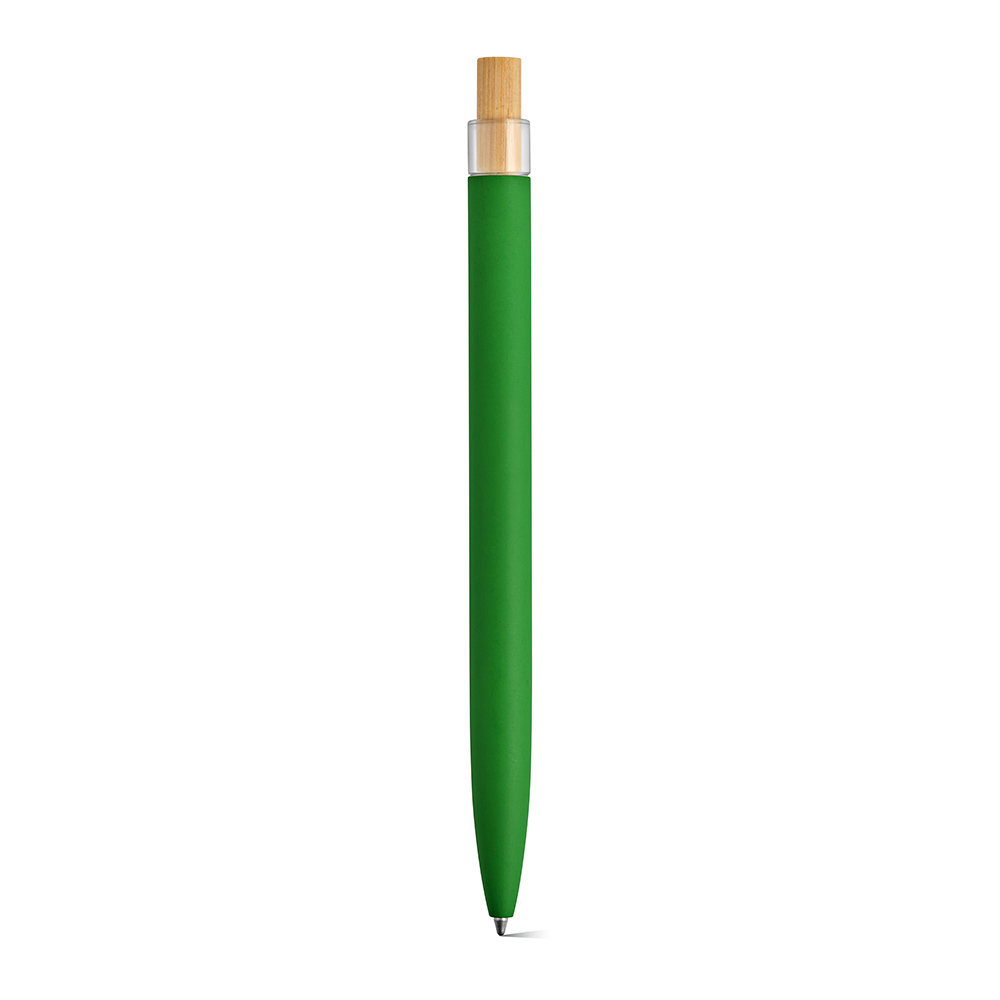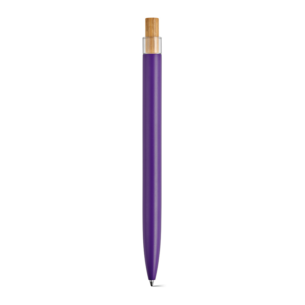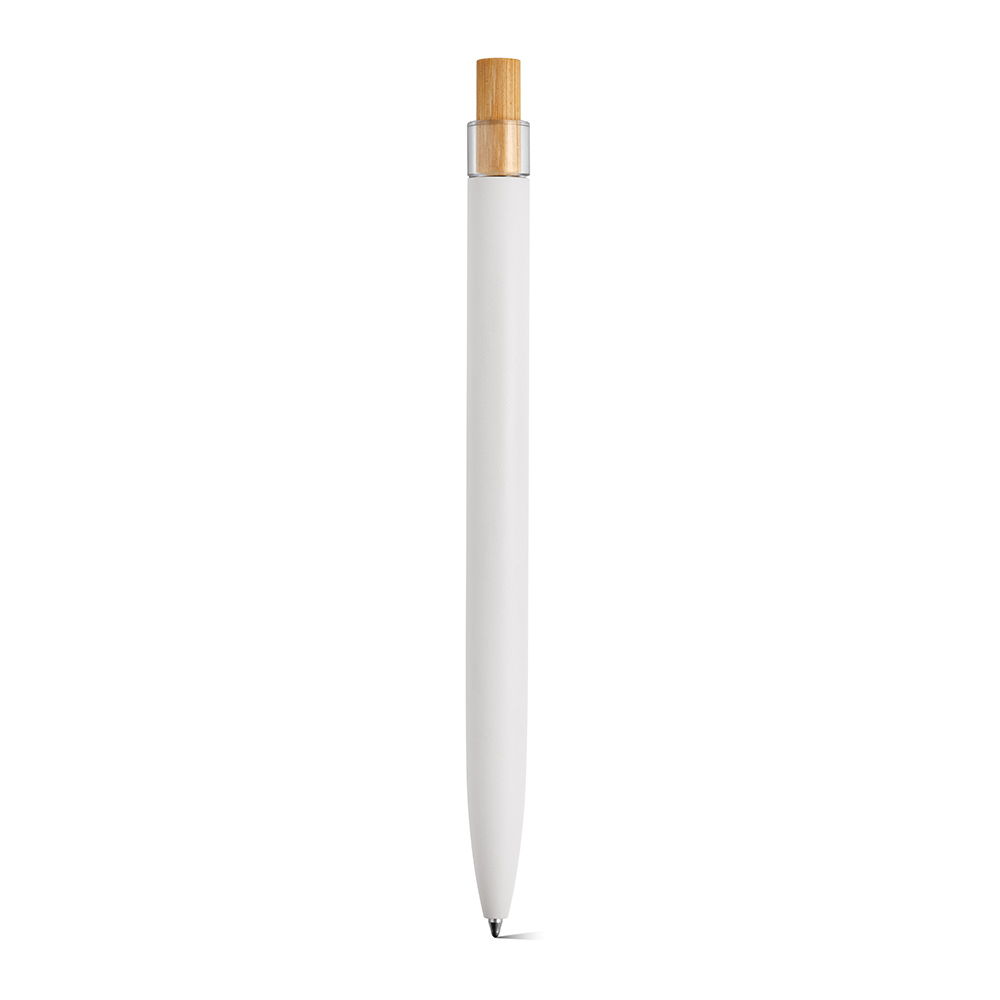Ein umweltbewusster Kugelschreiber, der mit einer Oberfläche aus recyceltem Aluminium und Element aus rPET und Bambus auf der Oberseite ausgestattet ist.