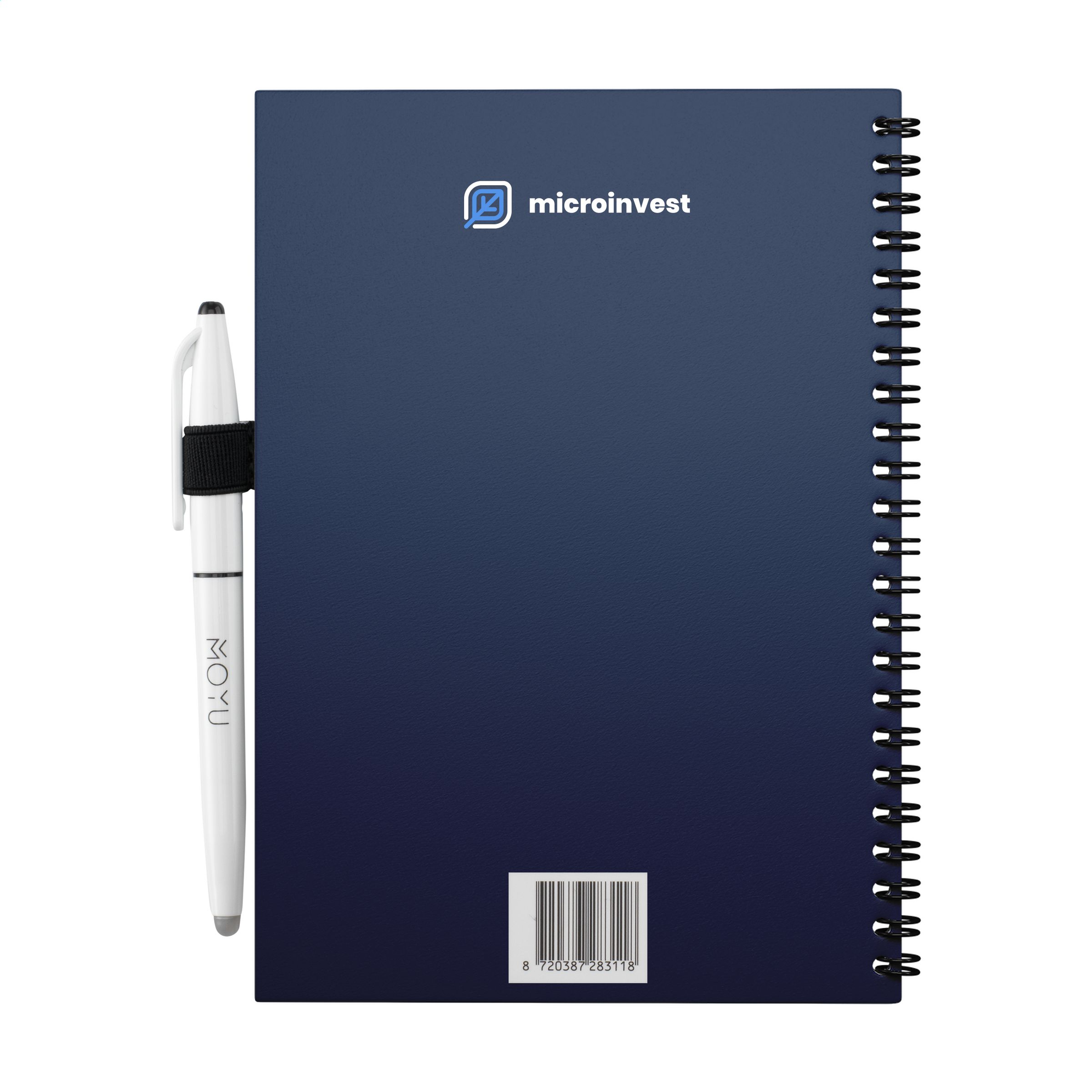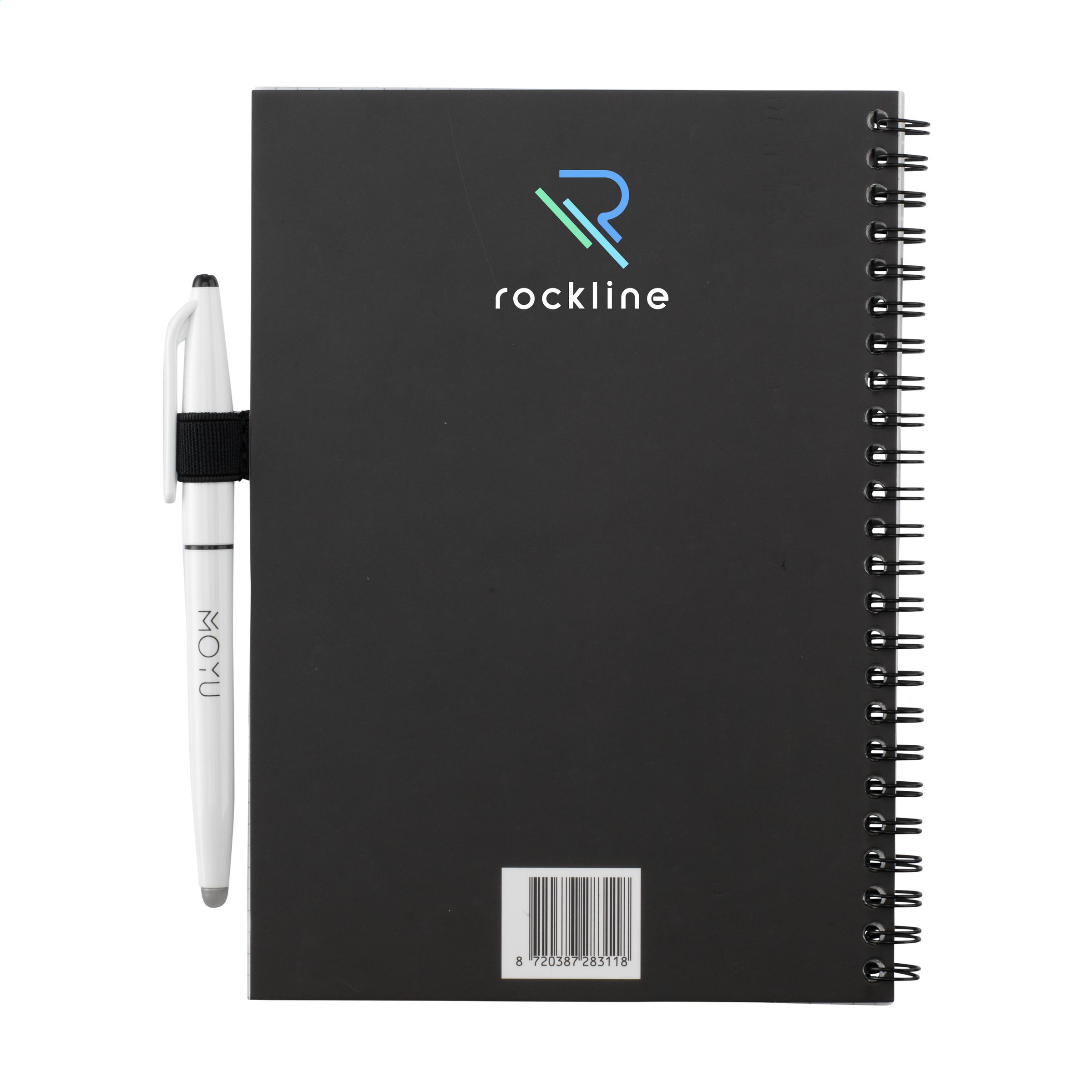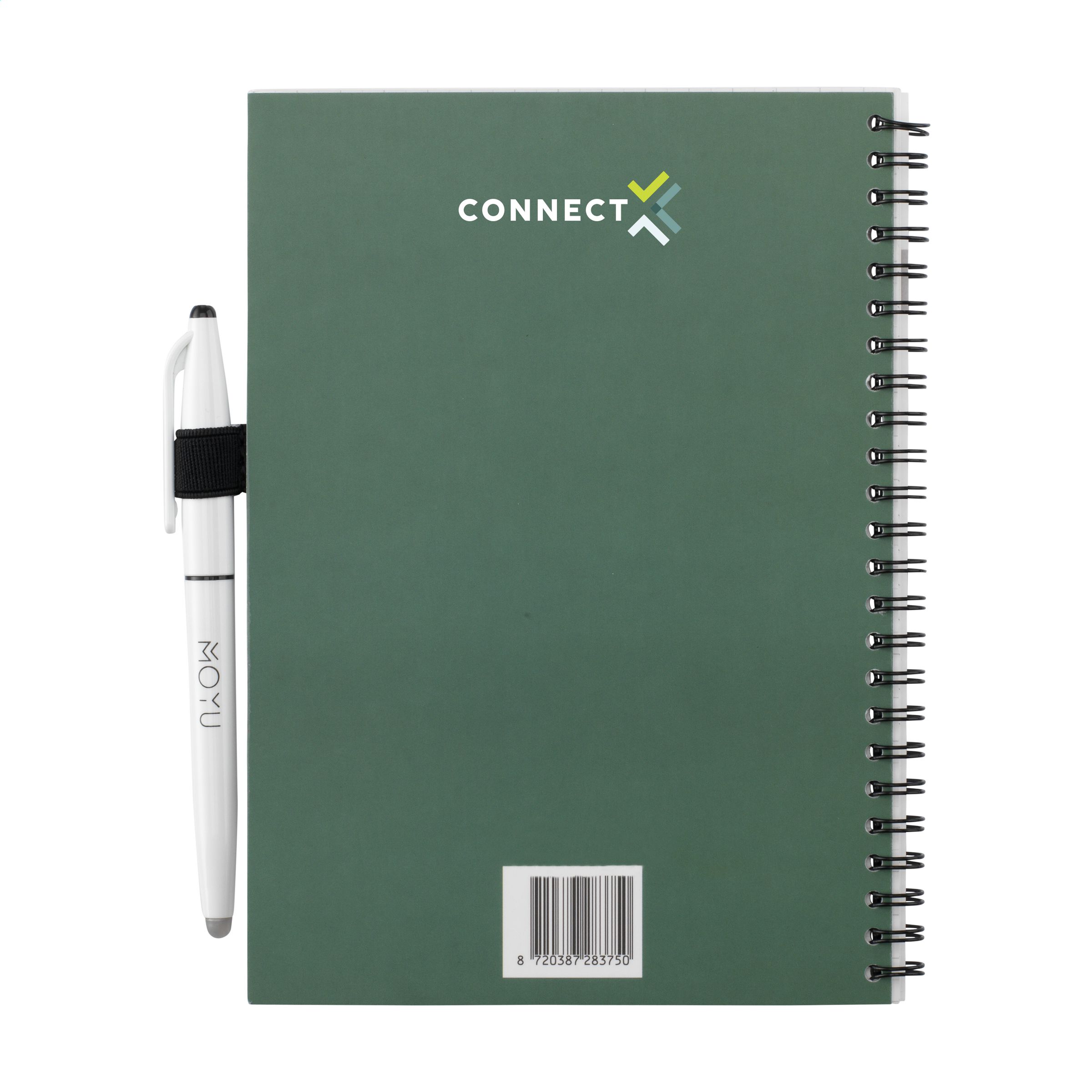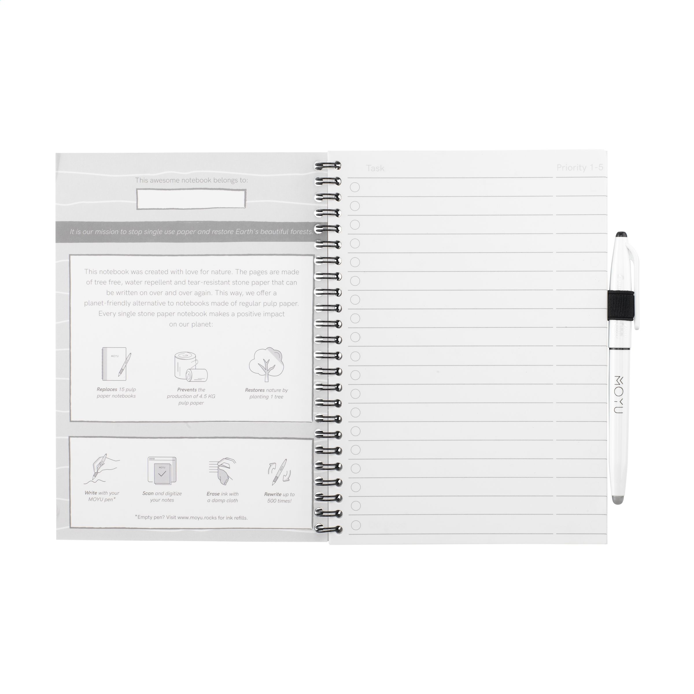 Wiederbeschreibbares A5-Notizbuch aus Steinpapier der Marke MOYU. Der extrastarke Umschlag besteht aus 700 Gramm Recyclingkarton. Inklusive Stift und Reinigungstuch. Jede Steinpapierseite ist nachhaltig produziert, kommt von Natur aus ohne Bäume aus und ist zu 100 % recycelbar. Dieses Notizbuch mit elastischer Stiftschlaufe ist in einer stabilen Wire-O-Bindung gebunden und umfasst 40 Seiten mit einem Wochenplaner, To-Do-Listen, liniertem Papier, Blankopapier, kariertem Papier und gepunktetem Papier. Erstellen Sie Ihre Notizen mit dem zugehörigen speziellen MOYU-Stift. Der Stift enthält die original Frixion-Tinte. Die Tinte trocknet vollständig auf dem Steinpapier und lässt sich leicht löschen, ohne Spuren zu hinterlassen. Befeuchten Sie das mitgelieferte MOYU-Tuch mit etwas Wasser und wischen Sie die Tinte ab. So erhalten Sie wieder leere Seiten für neue Ideen und To-Do-Listen. Im Durchschnitt kann man etwa 500 Mal auf Steinpapier schreiben. Dieses Notizbuch begleitet Sie über viele Jahre hinweg.