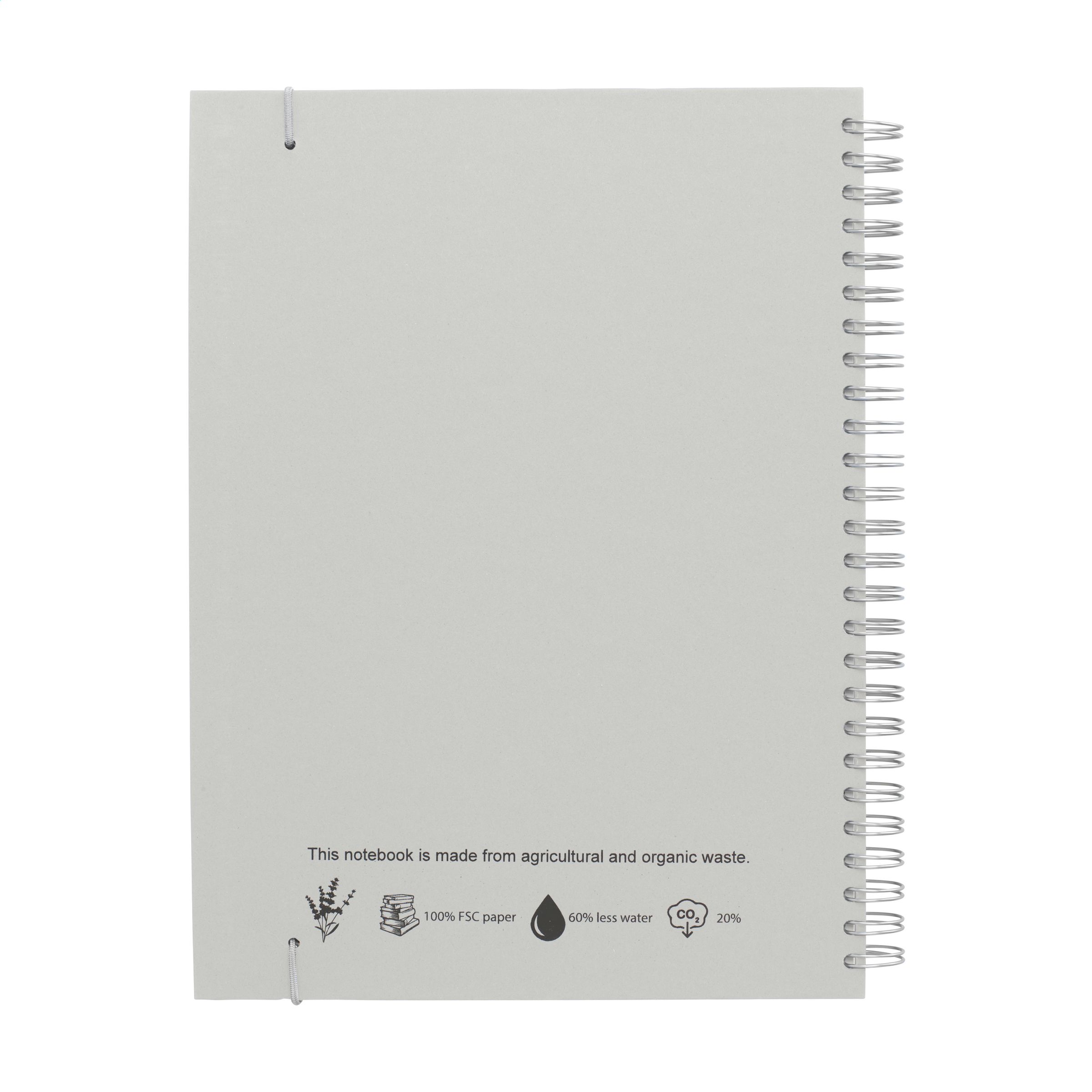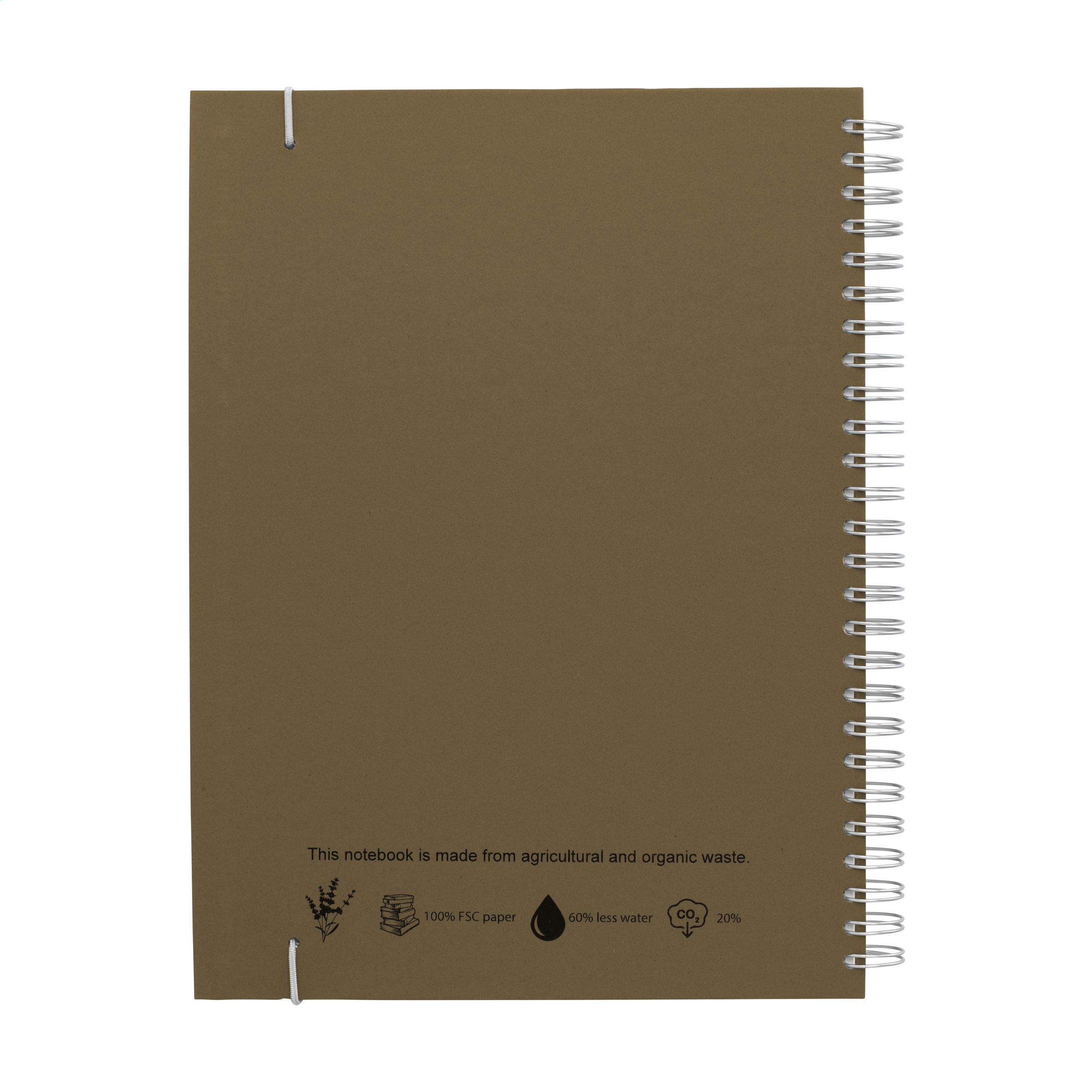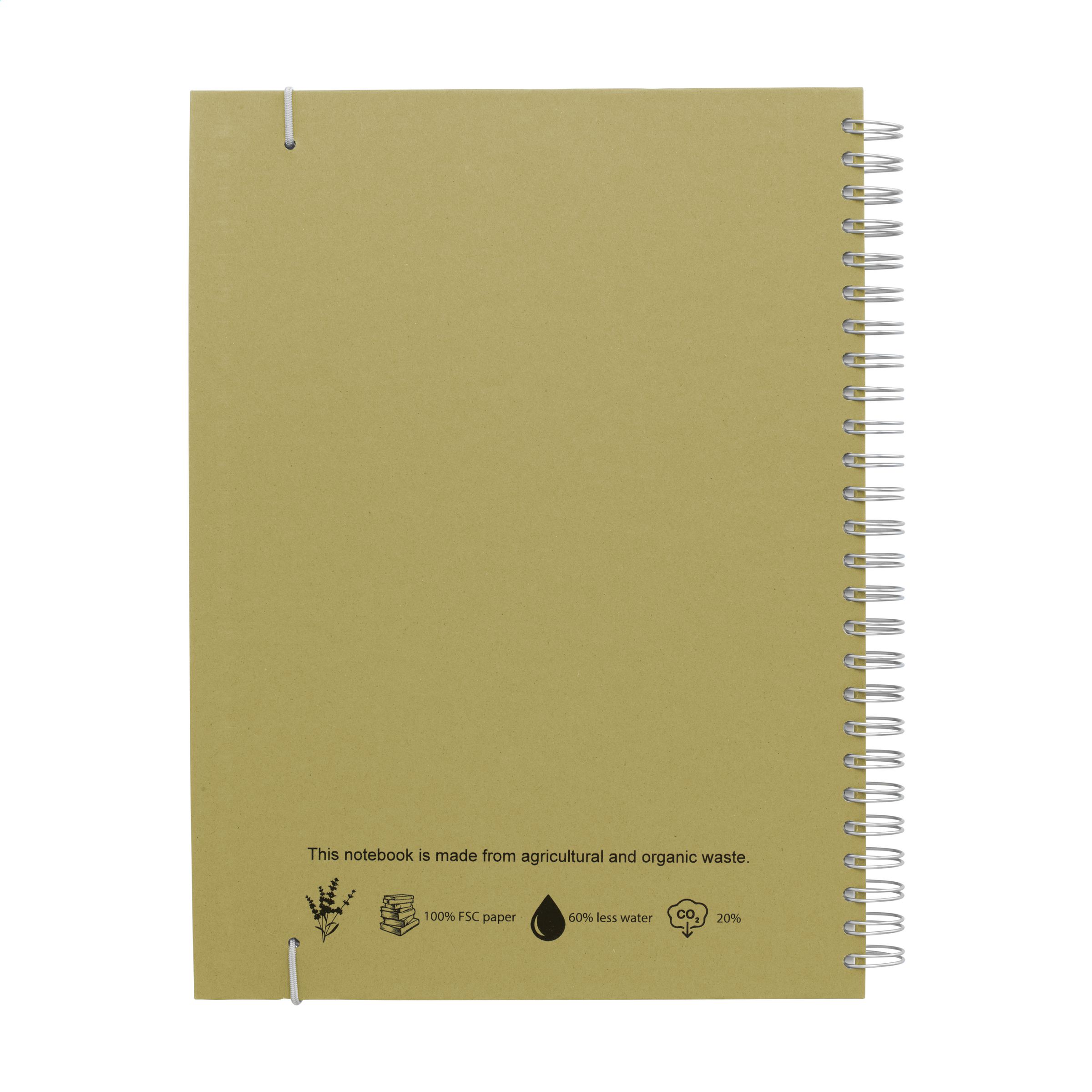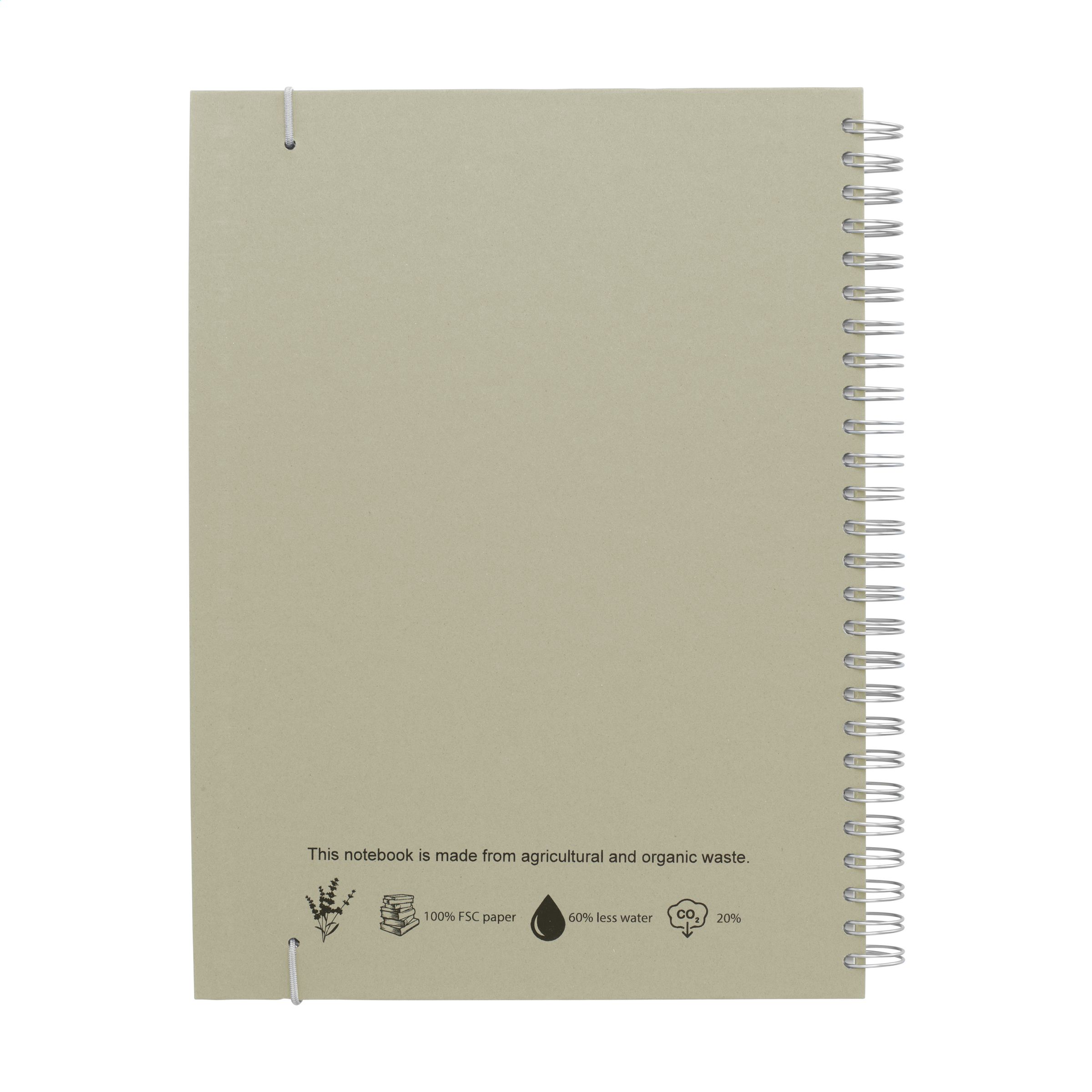WoW! Nachhaltiges Notizbuch im A5-Format. Mit 100 Blatt/200 Seiten liniertem Papier (80 g/m²), einer stabilen Wire-O-Bindung und einem Verschlussgummi. Der papierlose Hardcover-Einband besteht aus landwirtschaftlichen und organischen Abfällen, z. B. von Tomaten, Paprika, Pflanzen und Zwiebeln. Diese Abfälle werden mit Recyclingpapier aus Europa gemischt. Ein praktisches und umweltfreundliches Notizbuch, um Ideen zu notieren und festzuhalten.