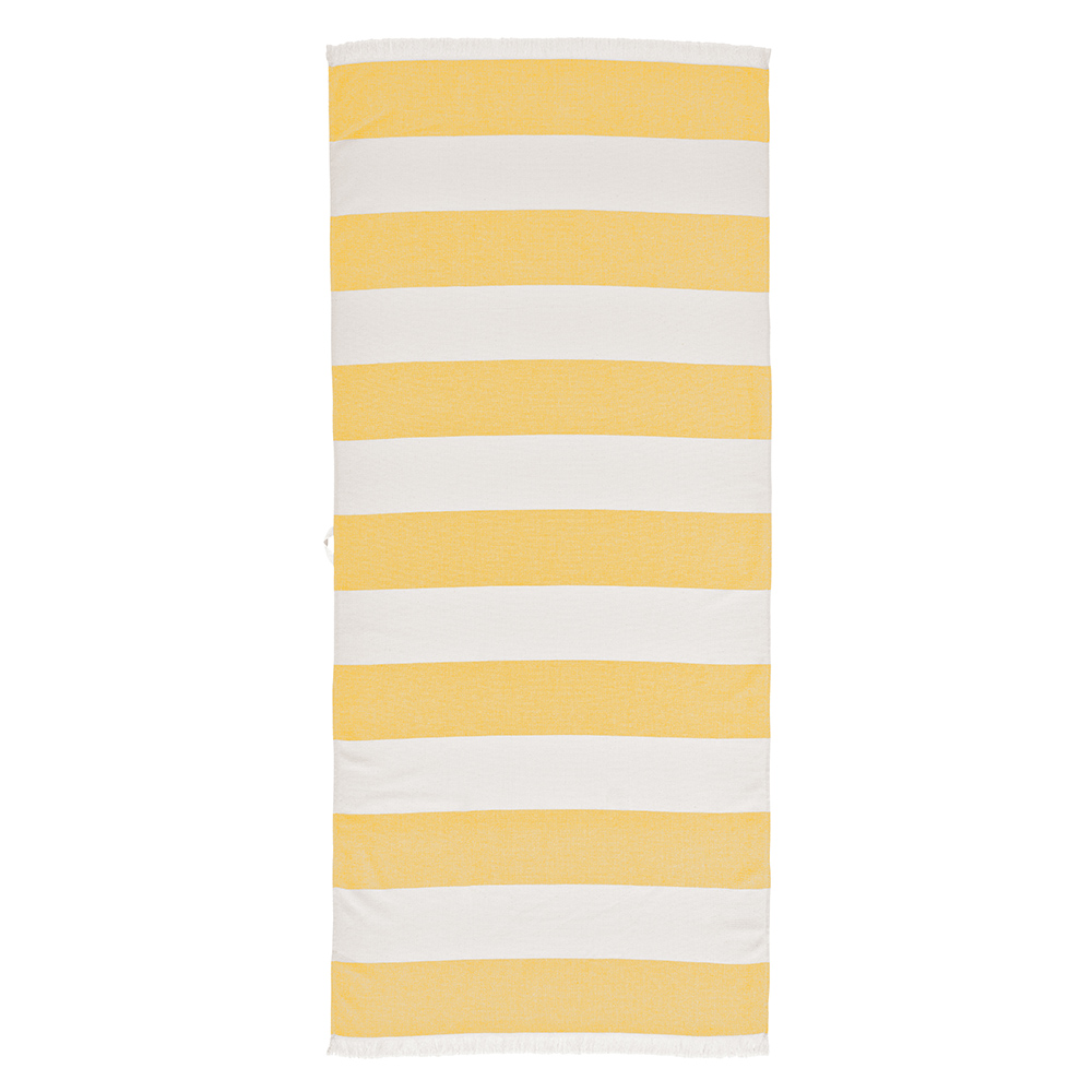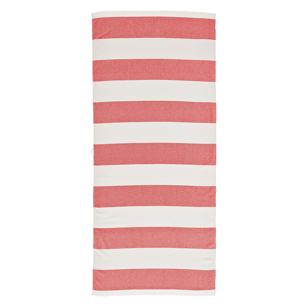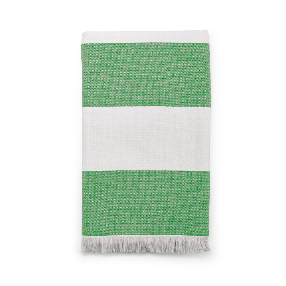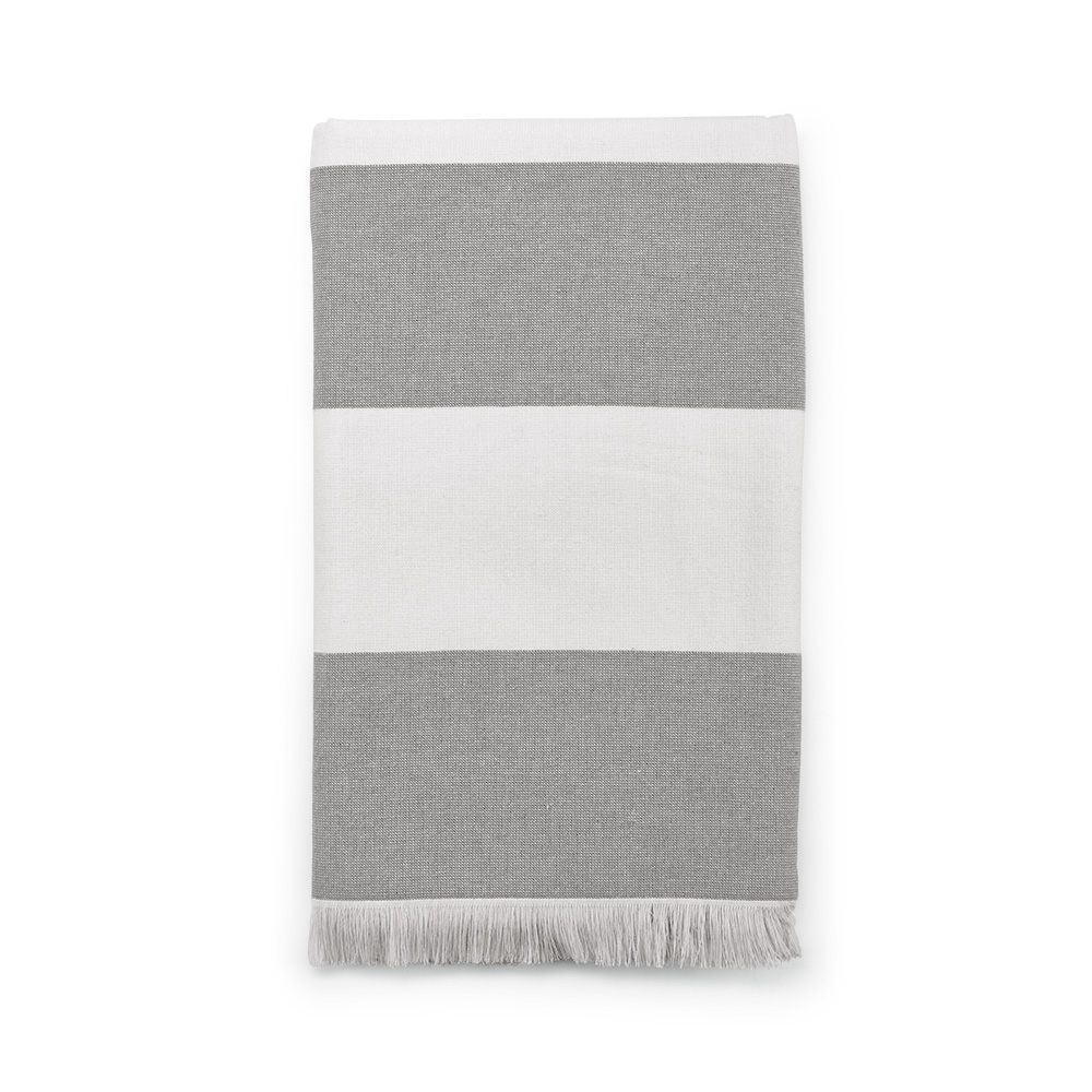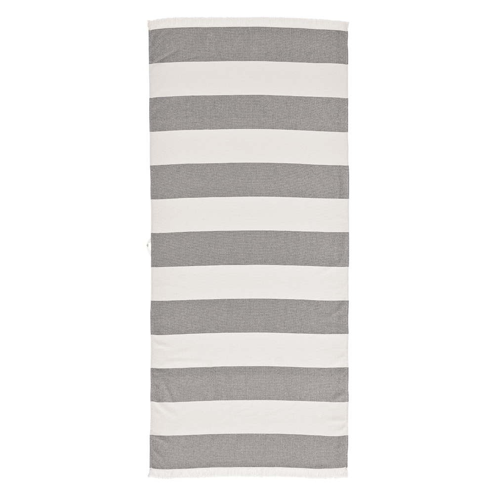 Das 350g/m2 Strandtuch aus recycelter Baumwolle (60% recycelte Baumwolle und 40% Baumwolle) ist mit Querstreifen gestaltet und hat eine Größe von 80 x 160 cm. Verziert mit Rand und Fransen ist es in biologisch abbaubaren Polybeutel verpackt und ein unbedenkliches Vergnügen für die Badesaison.