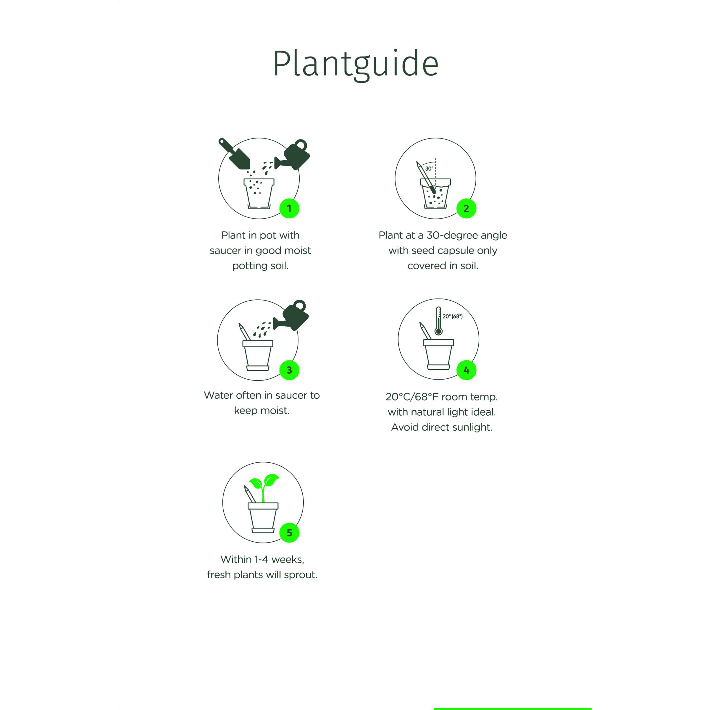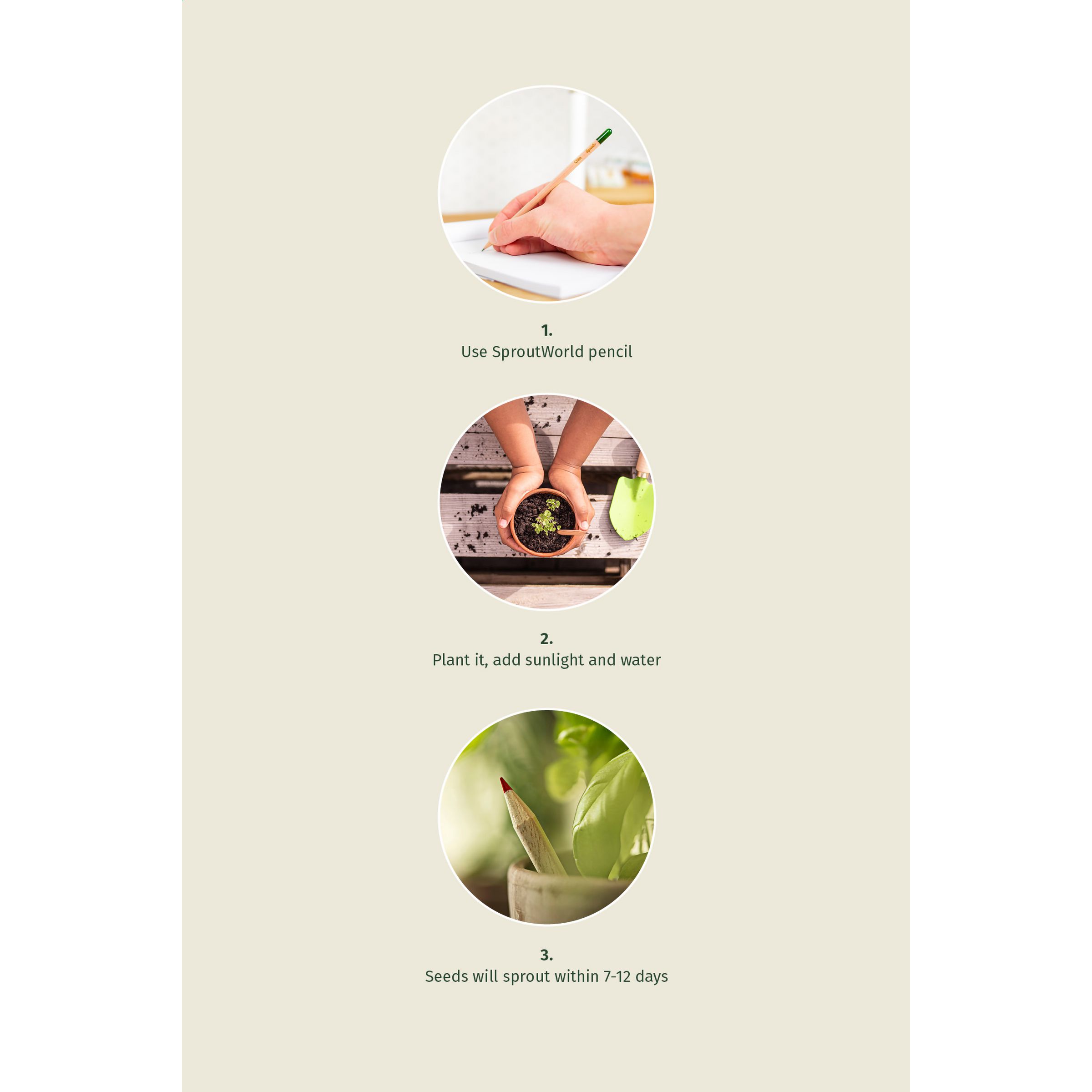 100% nachhaltiger Sproutworld-Bleistift mit einer grünen Botschaft. Dieser ungespitzte Bleistift ist aus Holz gefertigt. Am Ende des Bleistifts ist eine Kapsel (aus Zellulose) angebracht, die einige Samen enthält. Wenn der Stift zu klein geworden ist, um ihn zu verwenden, pflanzen Sie den Stift mit der Kapsel in die Erde. Nach etwa 2–3 Wochen keimen die Samen und entwickeln sich zu wunderschönen Blumen oder duftenden Kräutern. Wahlweise mit Sonnenblumen, Vergissmeinnicht, Rucola oder Basilikum. Der Name der Pflanze ist standardmäßig in den Bleistift eingraviert. Der Bleistift enthält kein Blei und ist daher völlig sicher. Made in Europe.