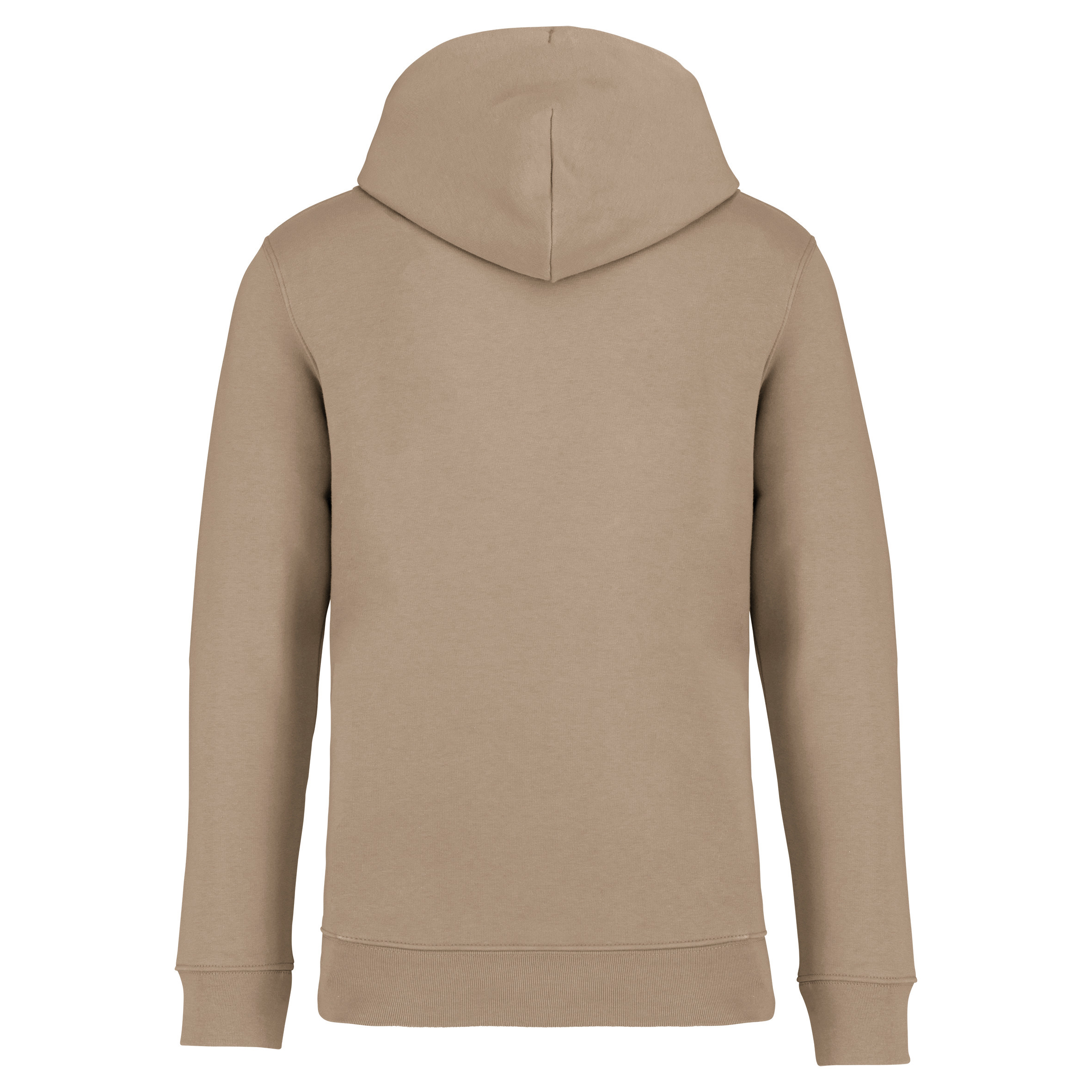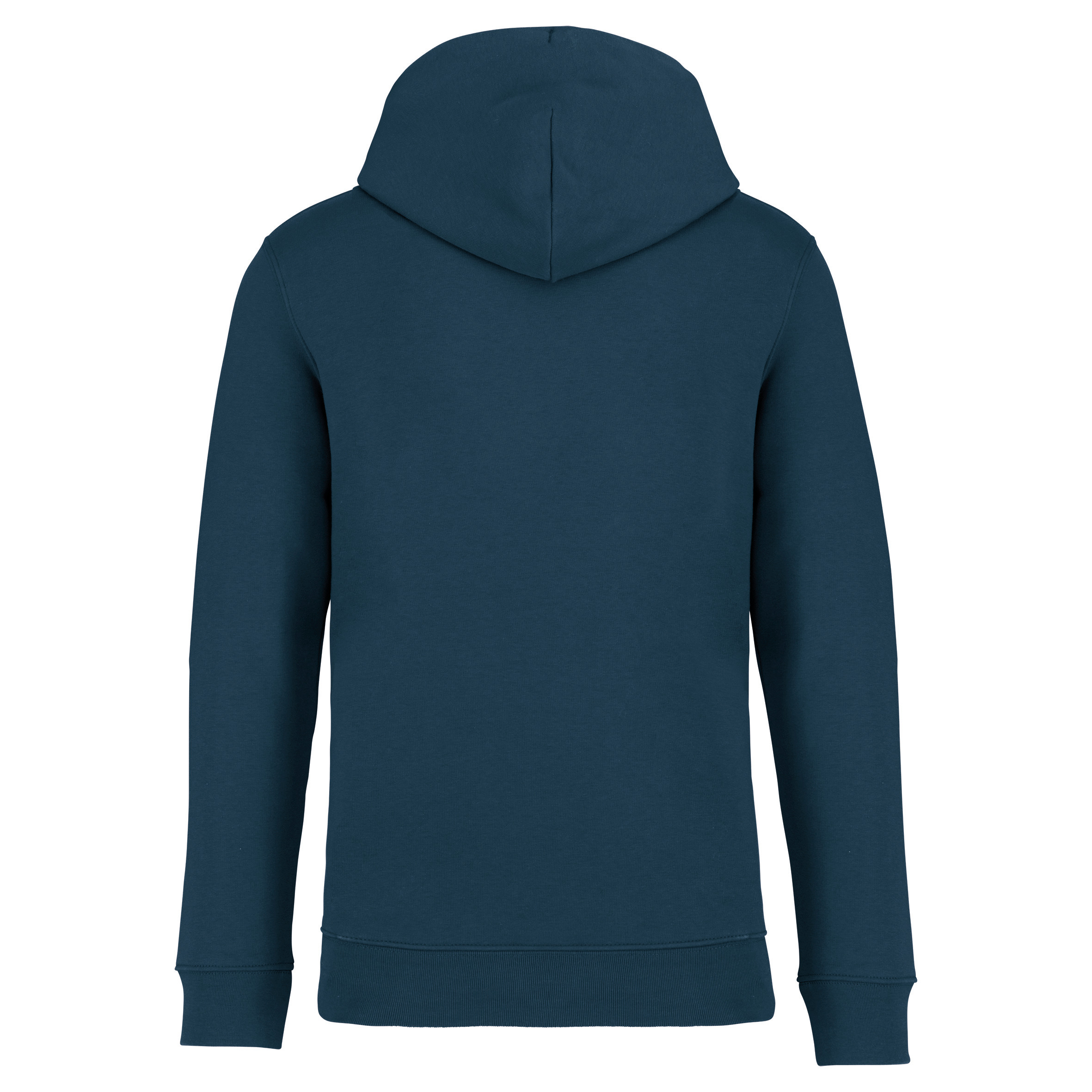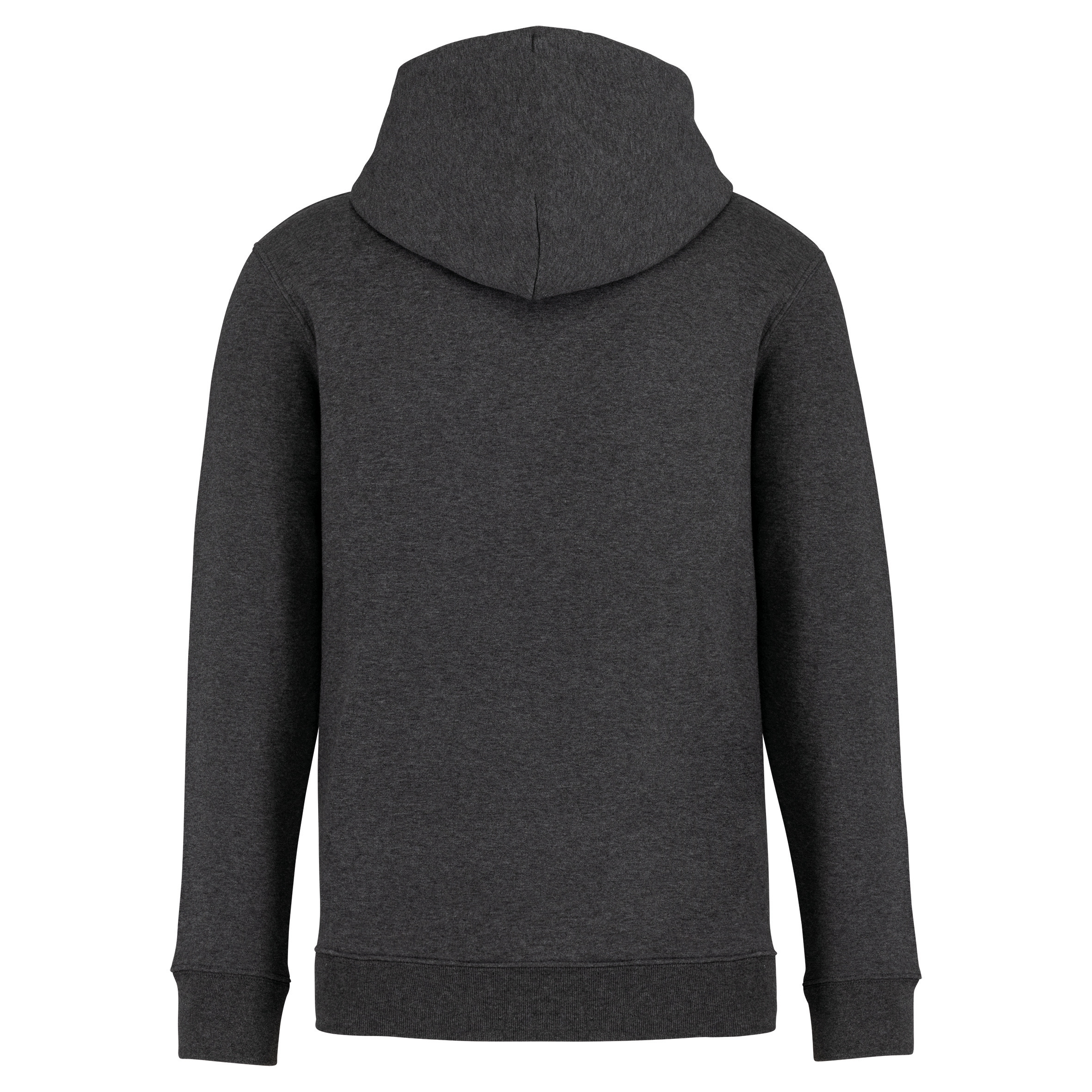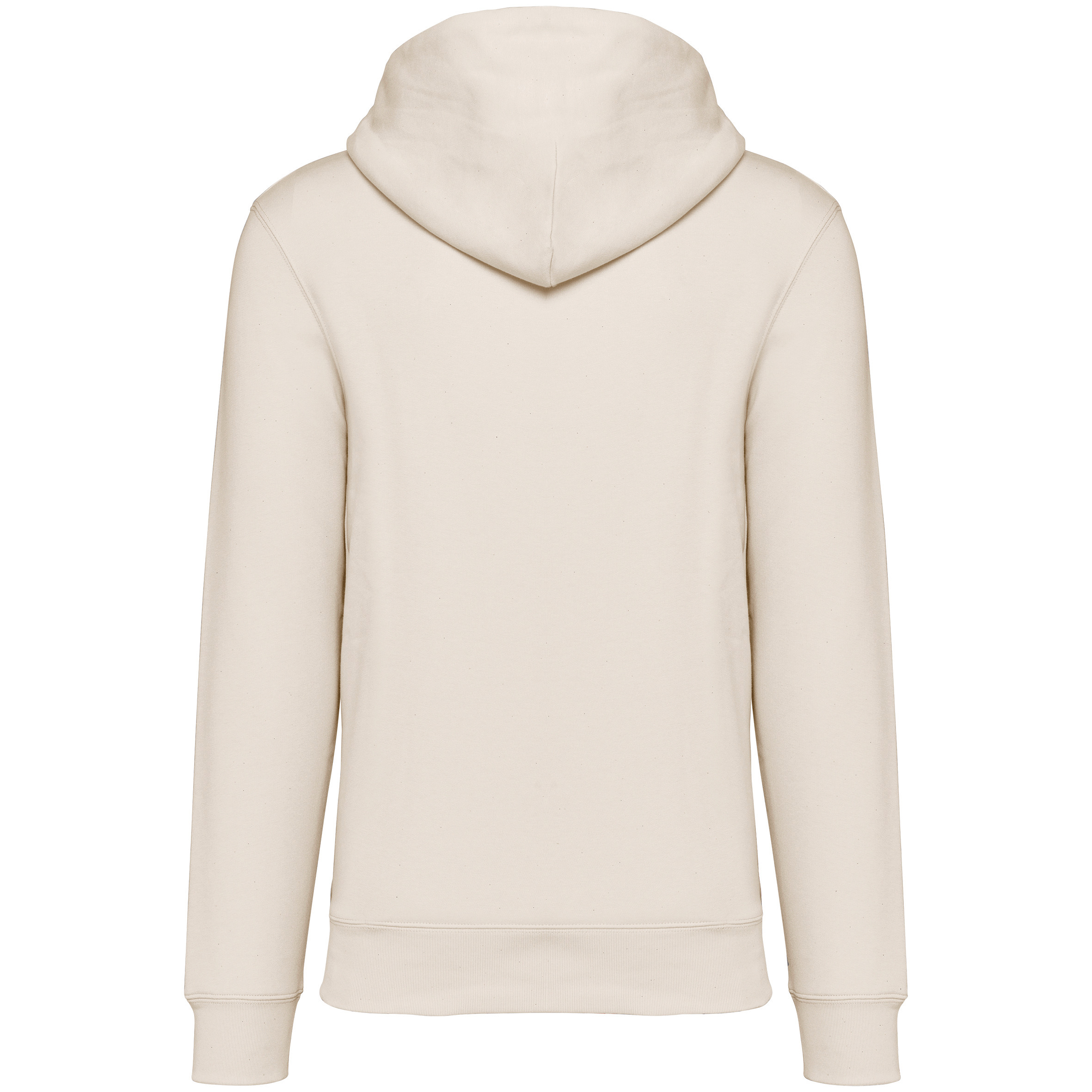 85 % Bio-Baumwolle / 15 % Post-Consumer-Polyester. Gekämmte Ringspun-Baumwolle. Körpernaher Schnitt. Enzymwäsche. Gebürstetes Molton, 3-fädiges LSF (Low Shrinkage Fleece: vorgeschrumpfter Molton). Halbmond am Rücken. Kängurutasche. Strickbündchen 1 x 1 am Saum und Ärmelbündchen. Doppel-Ziernaht an Ärmelbündchen, Armlöchern, Saum und Halbmond. Nackenband auf der Innenseite am. Halsausschnitt am Rücken. Gefütterte Kapuze aus Hauptmaterial mit Verstärkungsstich für Kordel. Abgerundeter Kordelzug mit Kappen und Ösen aus recyceltem Metall.