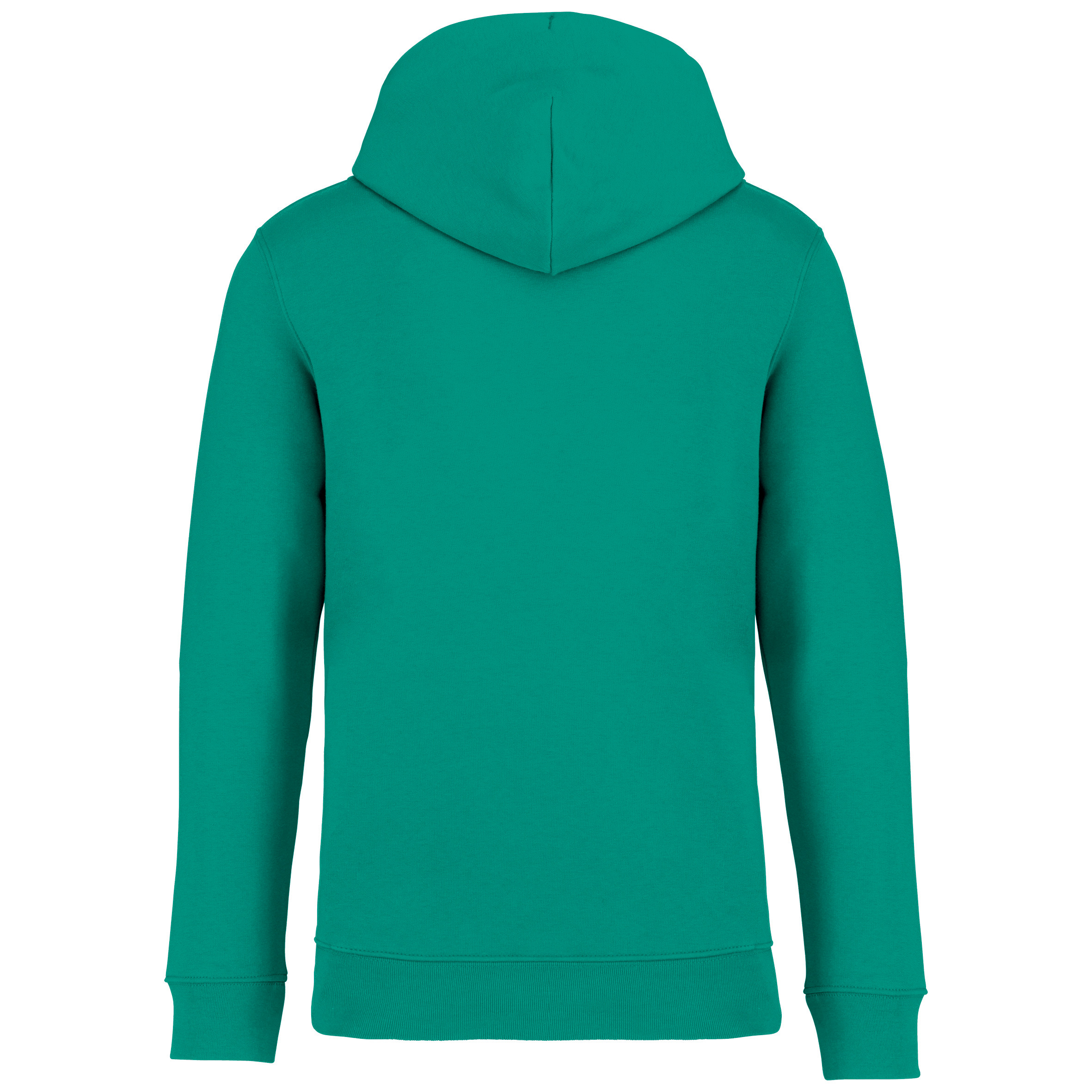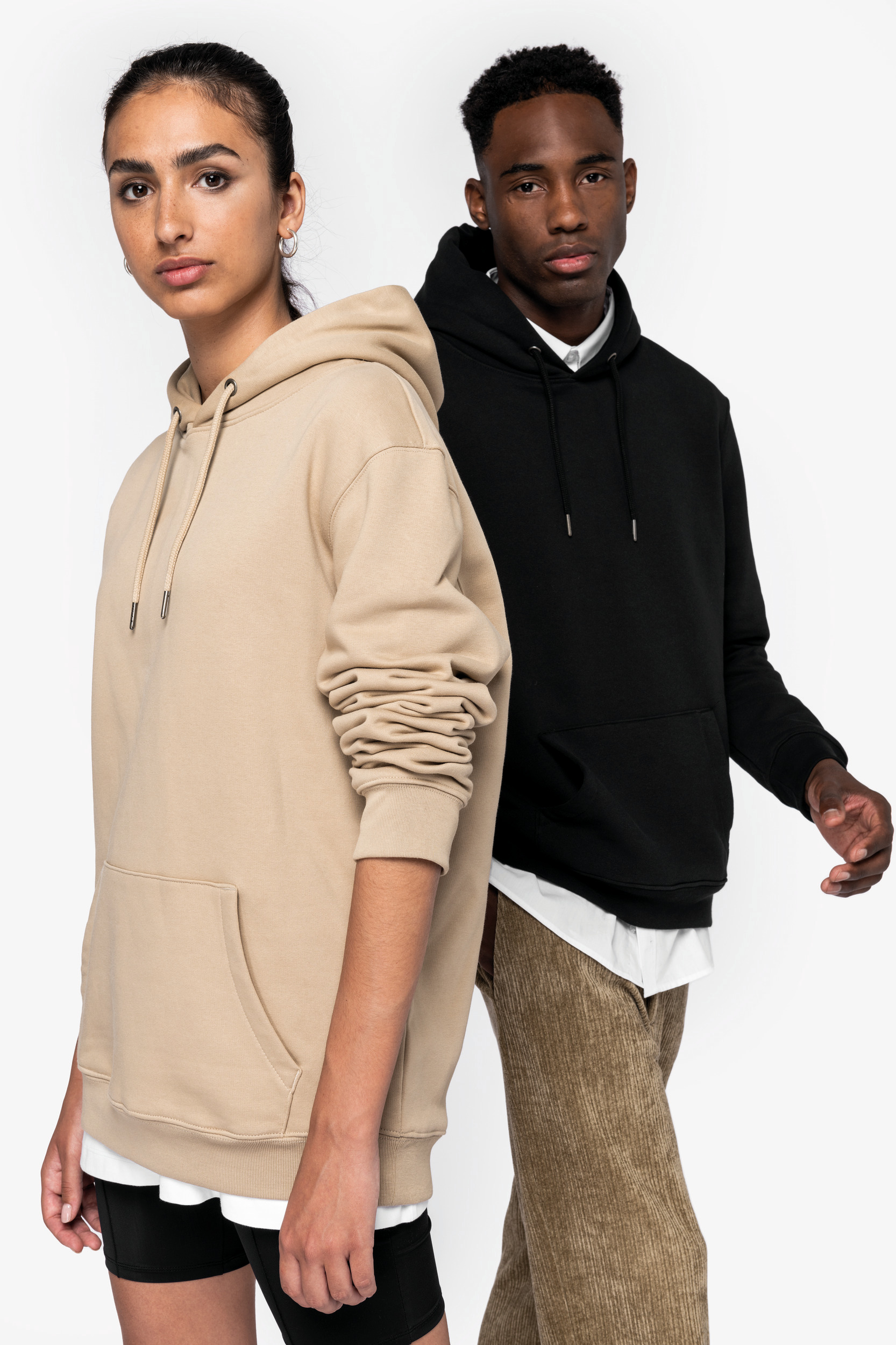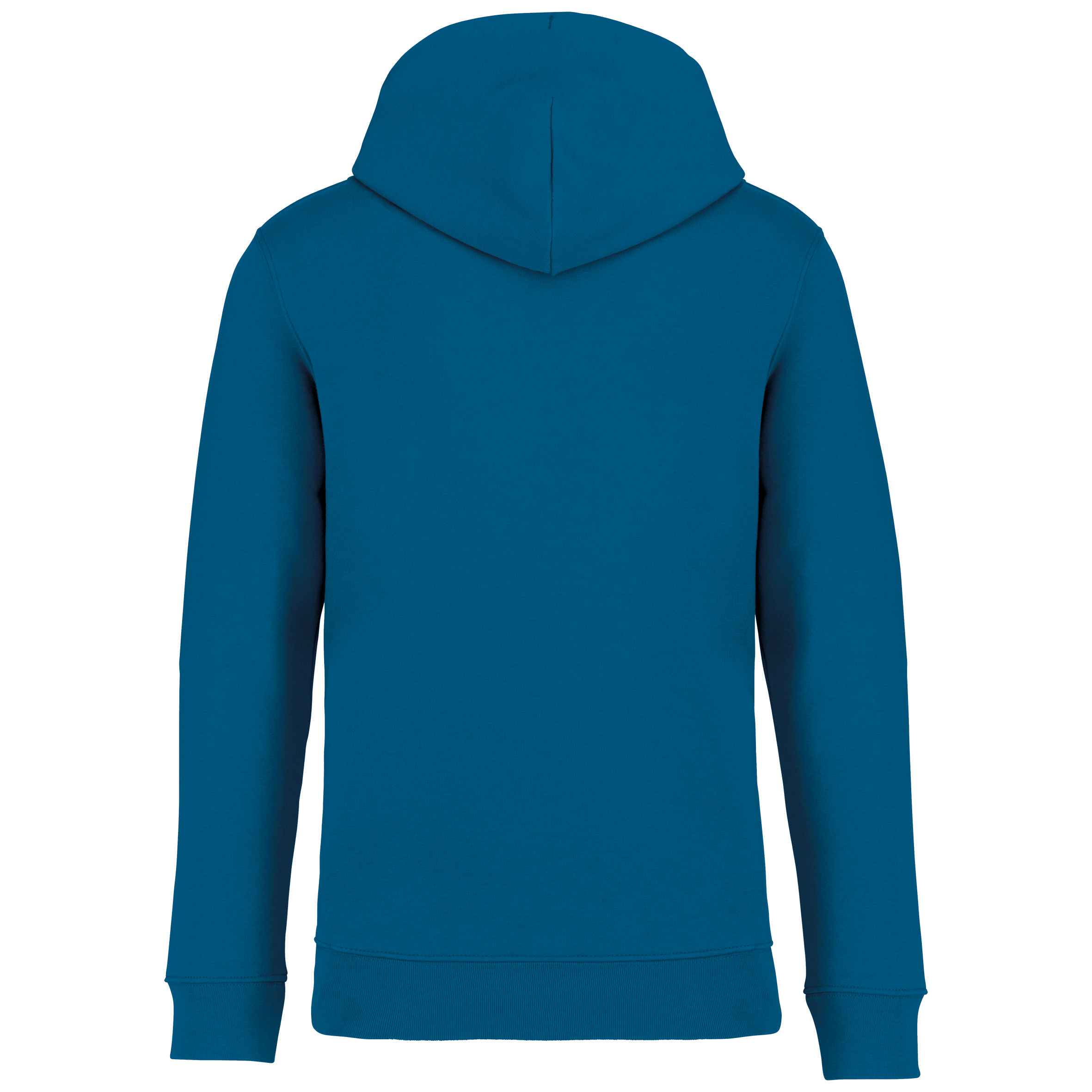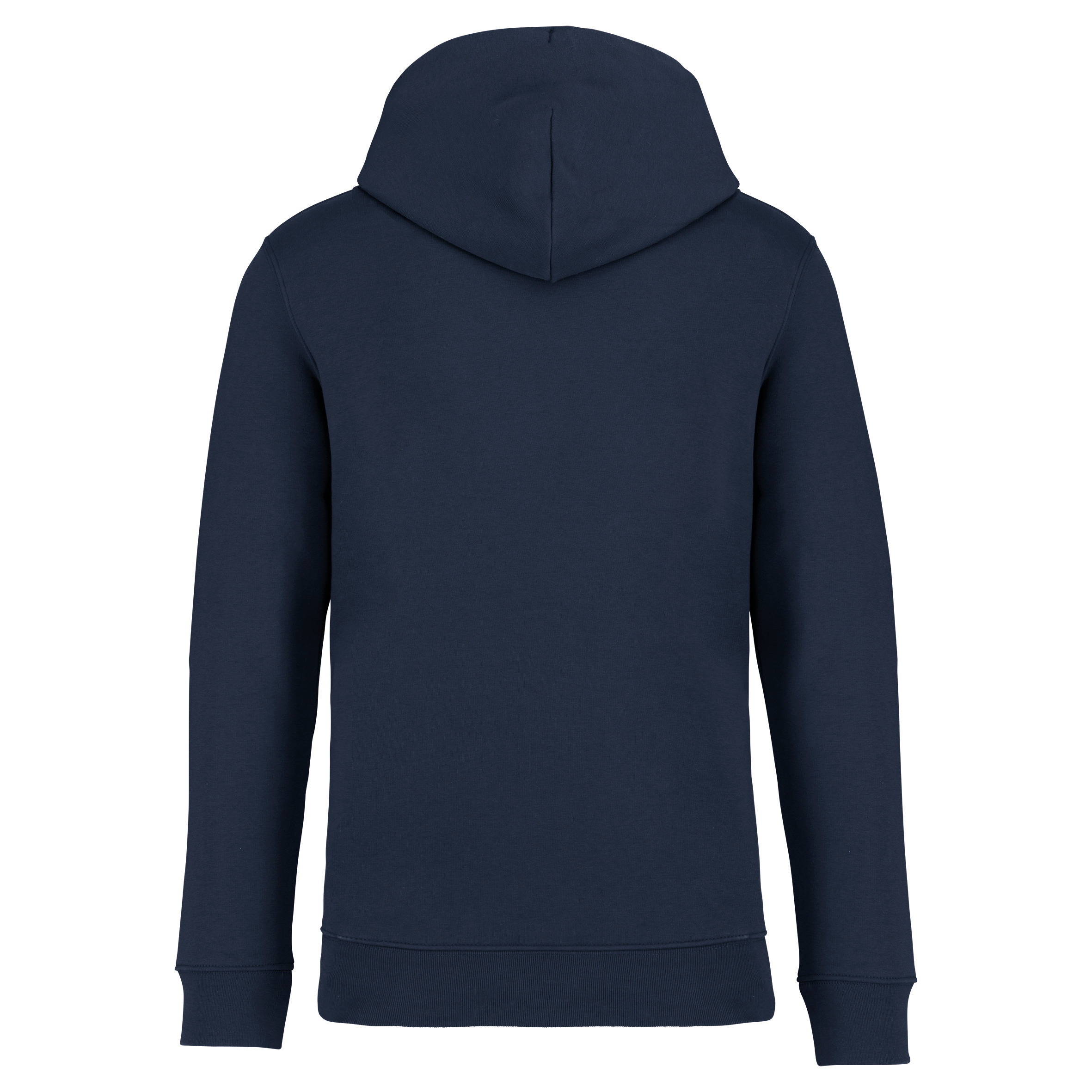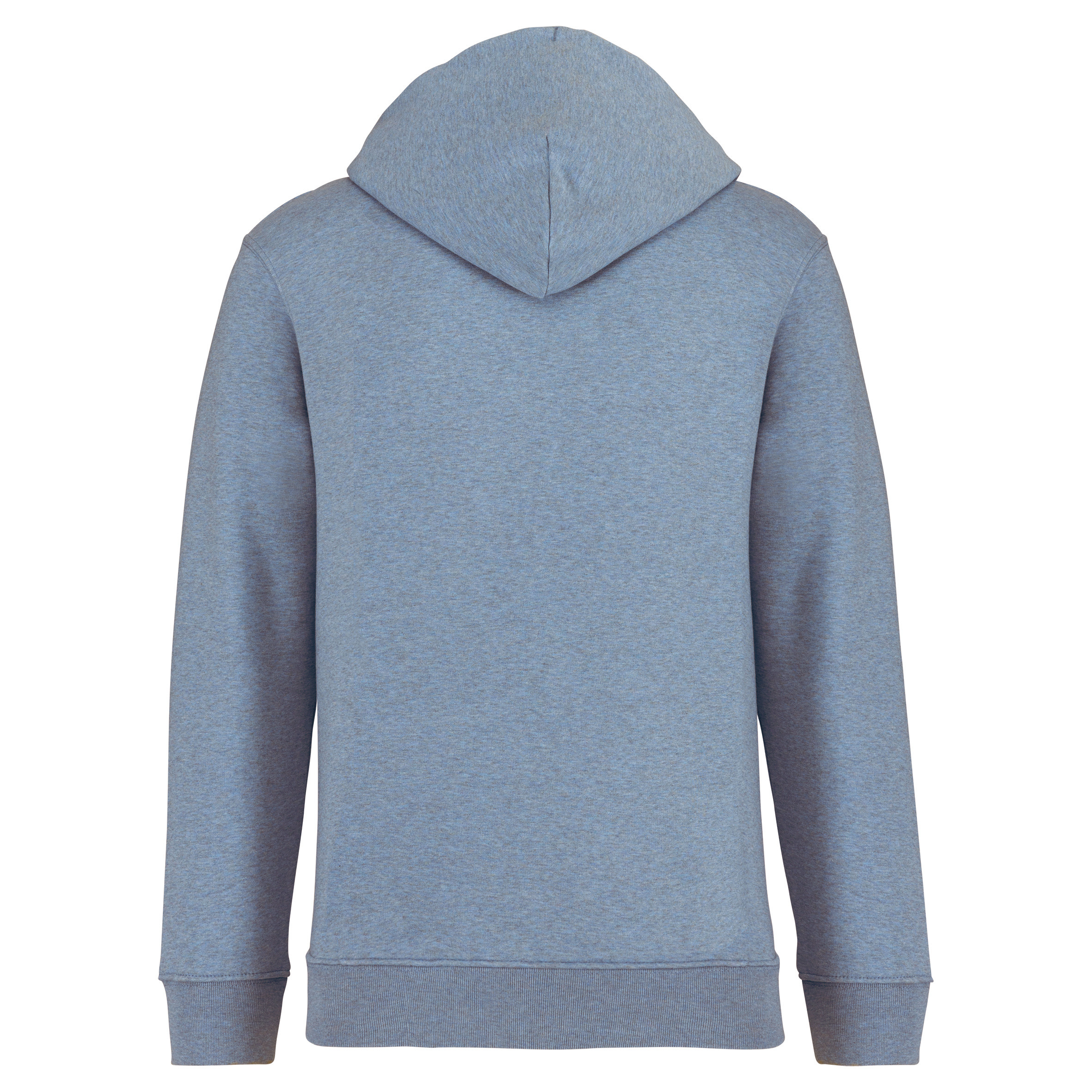 85 % Bio-Baumwolle / 15 % Post-Consumer-Polyester. Gekämmte Ringspun-Baumwolle. Körpernaher Schnitt. Enzymwäsche. Gebürstetes Molton, 3-fädiges LSF (Low Shrinkage Fleece: vorgeschrumpfter Molton). Halbmond am Rücken. Kängurutasche. Strickbündchen 1 x 1 am Saum und Ärmelbündchen. Doppel-Ziernaht an Ärmelbündchen, Armlöchern, Saum und Halbmond. Nackenband auf der Innenseite am. Halsausschnitt am Rücken. Gefütterte Kapuze aus Hauptmaterial mit Verstärkungsstich für Kordel. Abgerundeter Kordelzug mit Kappen und Ösen aus recyceltem Metall.