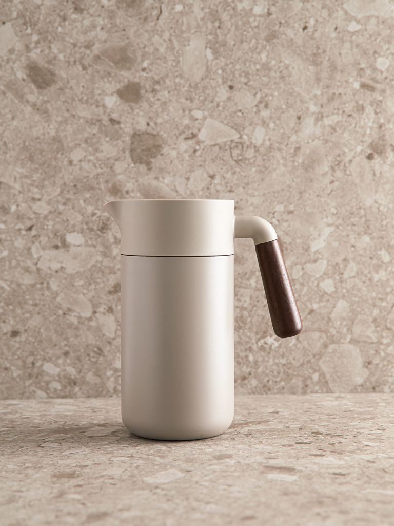 Klassische Thermoskanne im skandinavischen Design. Rostfrei und bruchsicher mit Druckknopf und Walnussholzgriff. Leicht zu halten und einfach zu gießen. Große Öffnung für einfaches Befüllen und Reinigen.