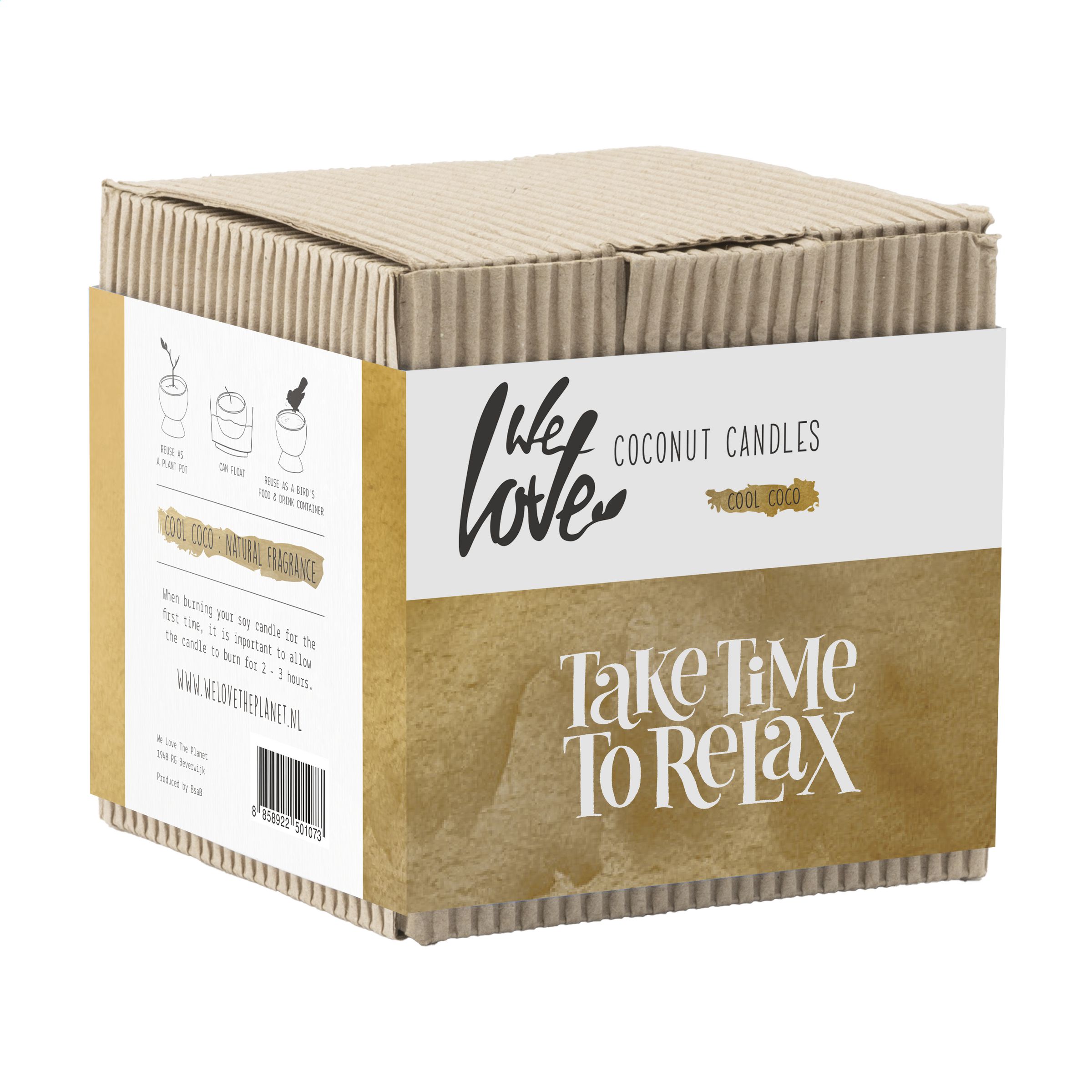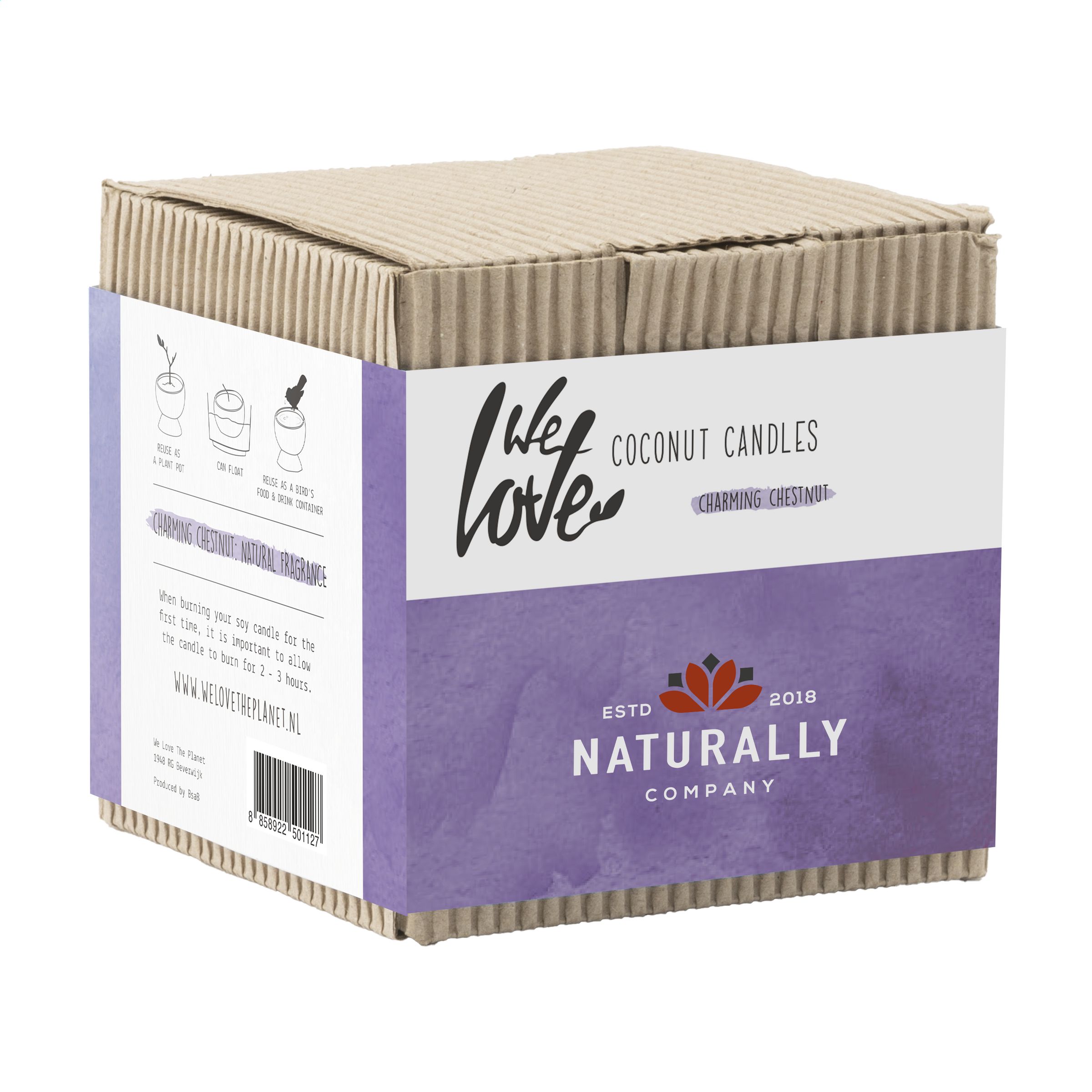 Die natürliche Kokosnuss-Kerze der Marke ‚We Love The Planet‘ besteht zu 100% aus Sojawachs.