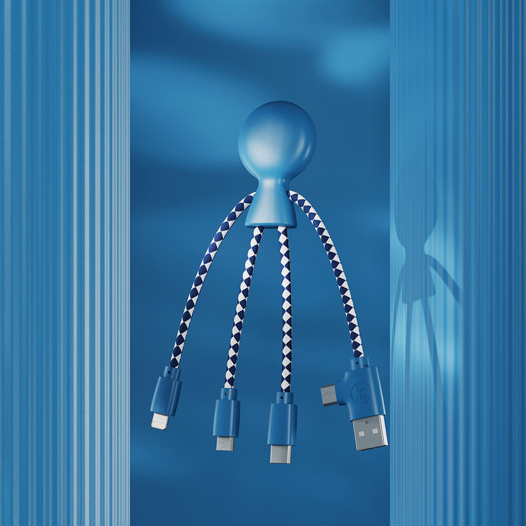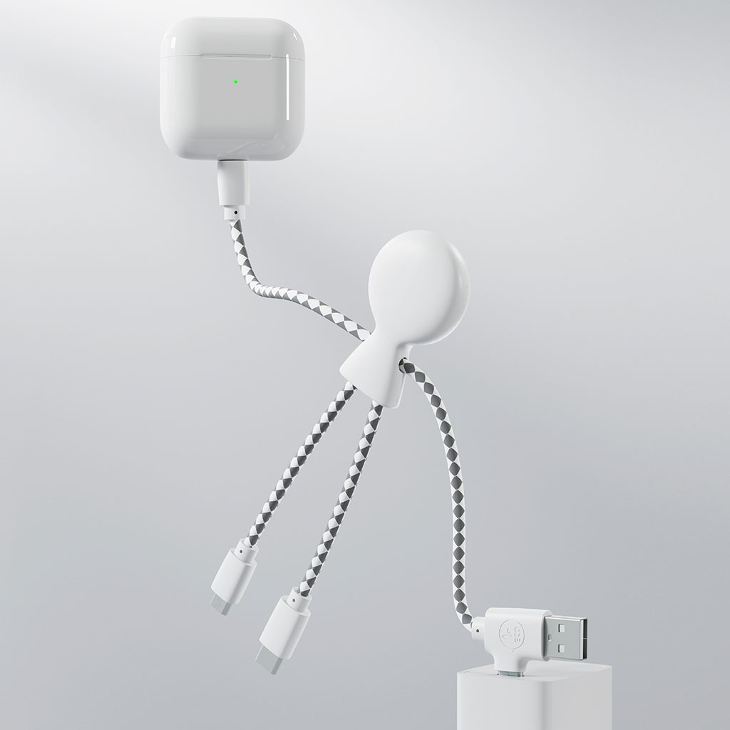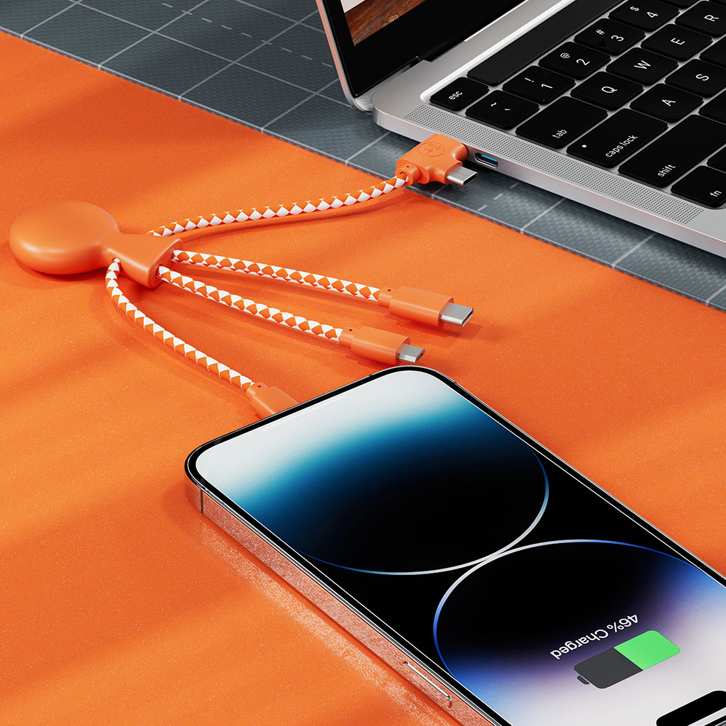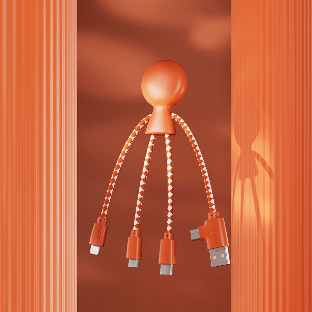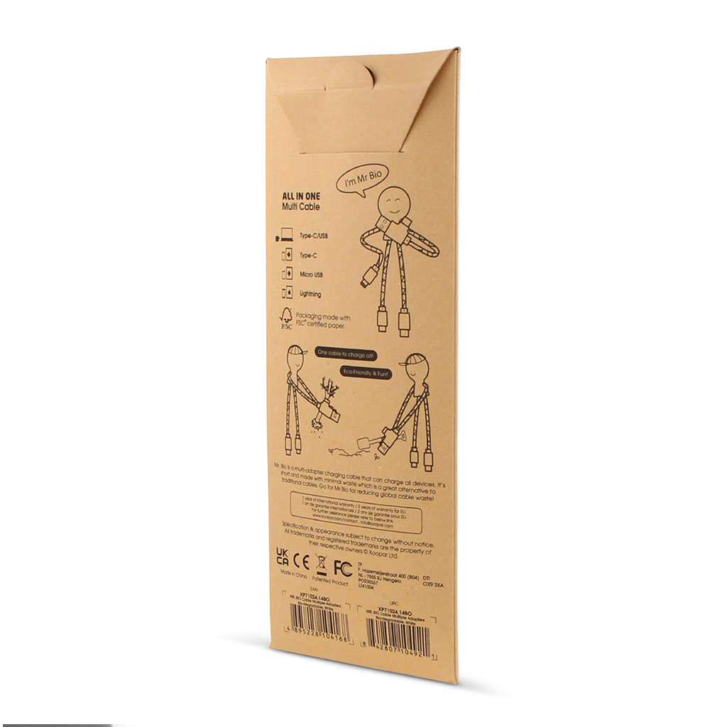 Mr. Bio ist ein Multiladekabel mit einem dualen USB- und USB-C-Eingang und drei verschiedenen Anschlüssen zum umweltfreundlichen Laden Ihrer Geräte!