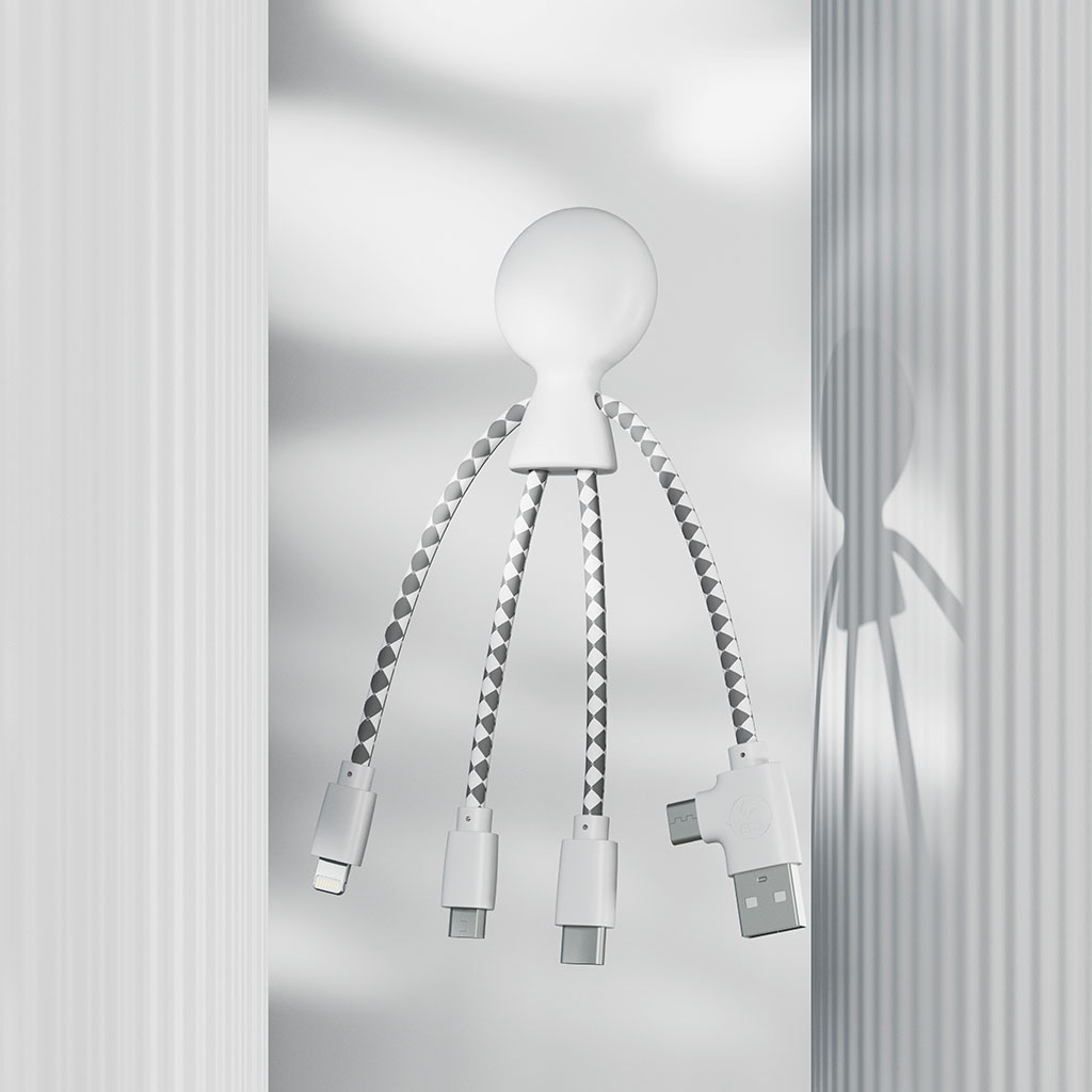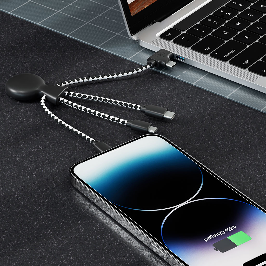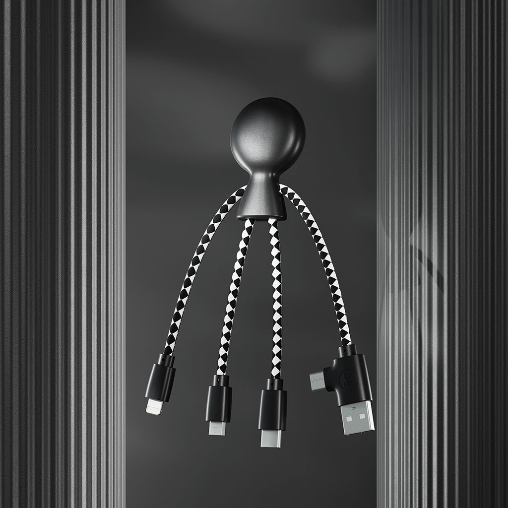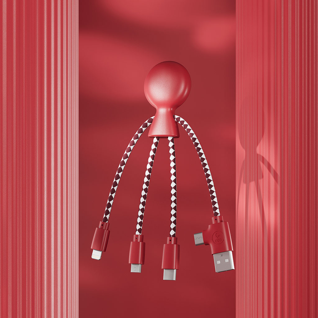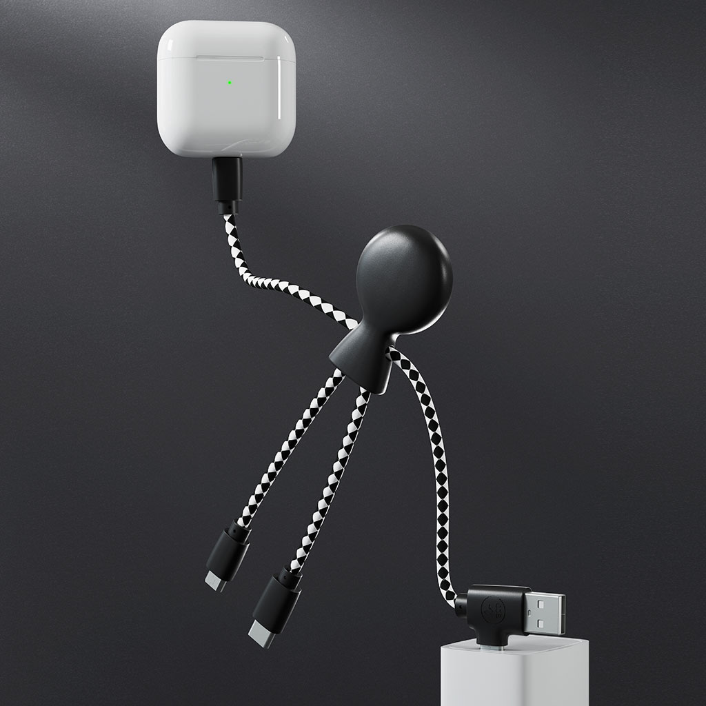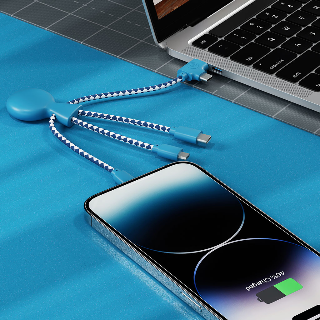 Mr. Bio ist ein Multiladekabel mit einem dualen USB- und USB-C-Eingang und drei verschiedenen Anschlüssen zum umweltfreundlichen Laden Ihrer Geräte!